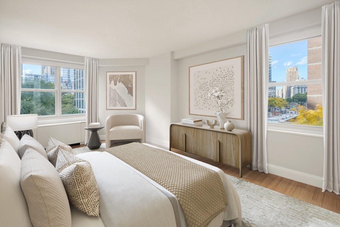 Residence 34E is an oversized 2-bedroom home with east, west and north exposures. Residences at 155 West 68th Street are designed with both style and comfort in mind featuring thoughtful oversized layouts supporting an elevated lifestyle. This 1,213 square foot residence features a suite of contemporary kitchen appliances and modern cabinetry, expansive windows offering abundant natural light, overhead lighting, and ample storage. Bathrooms include radiant heat floors, marble and porcelain finishes, complimented with stylish fixtures. Individual climate control is available in every residence for personalized comfort.
