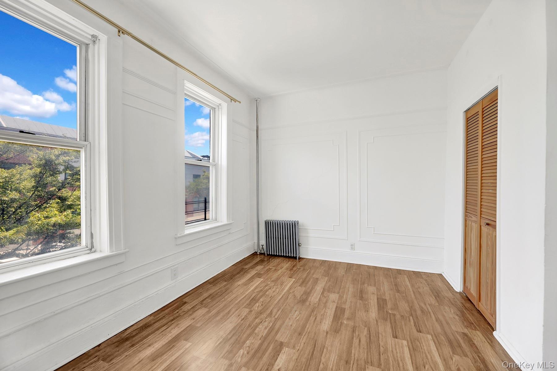 - Unfurnished bedroom with radiator, light wood-type flooring, multiple windows, and a closet
