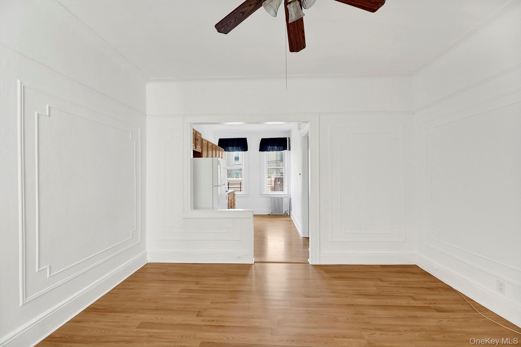 - Spare room with ceiling fan, a decorative wall, radiator heating unit, and light wood-style flooring