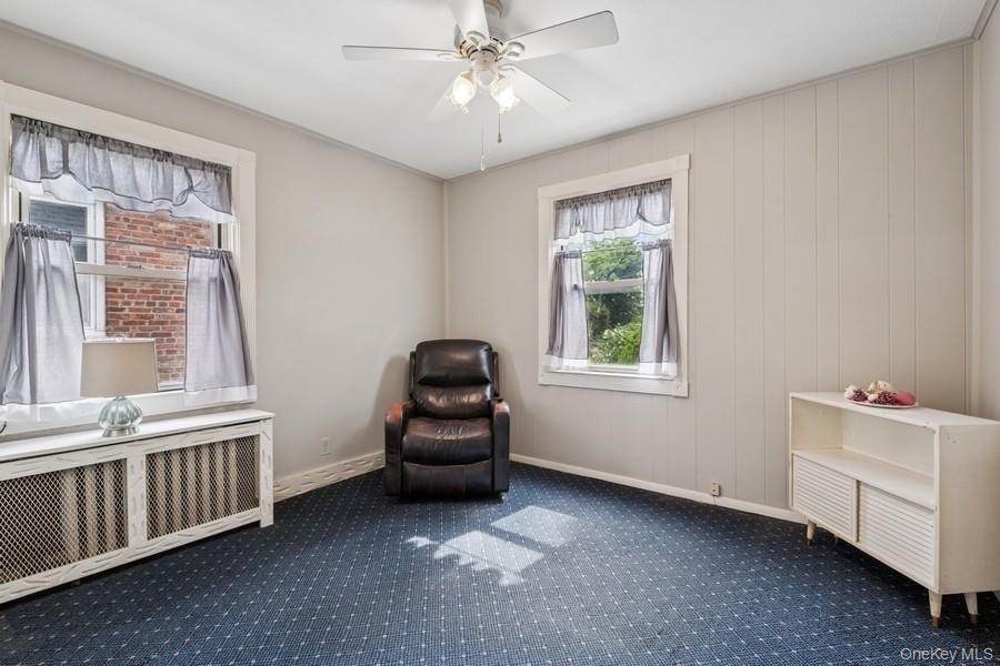 - Sitting room featuring radiator heating unit, ceiling fan, and carpet floors
