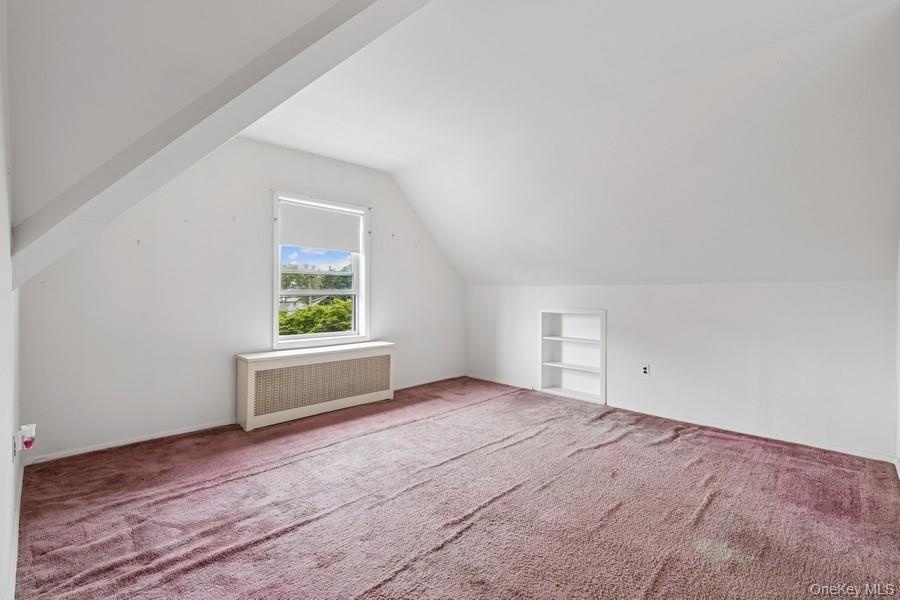 - Additional living space featuring lofted ceiling, built in shelves, radiator heating unit, and carpet flooring