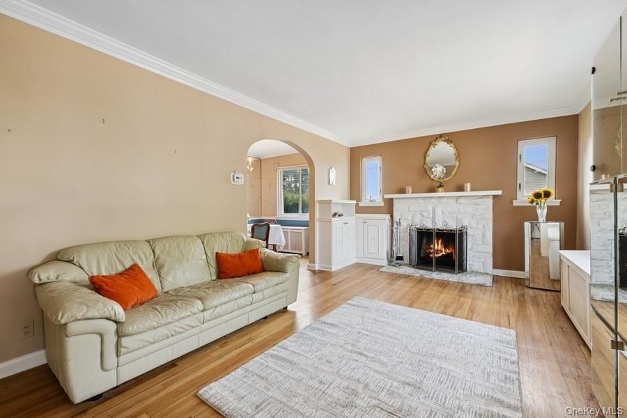 - Living room with a stone fireplace, radiator heating unit, light wood-style floors, crown molding, and arched walkways