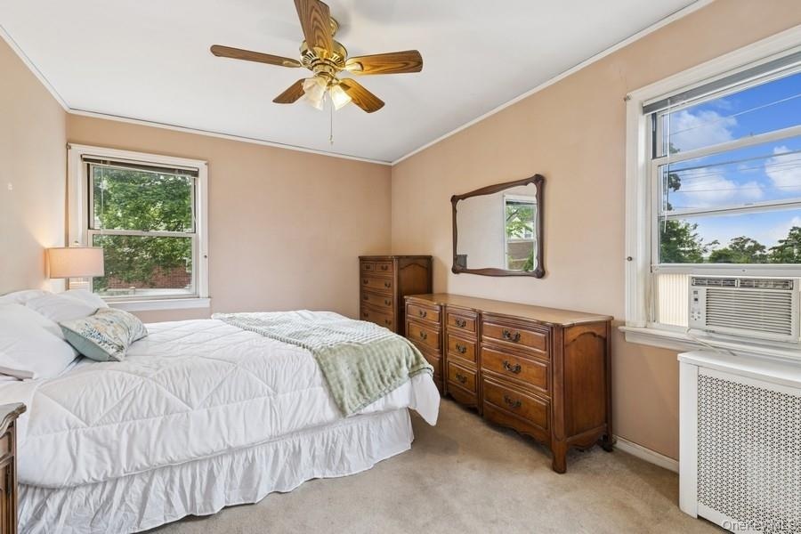 - Bedroom featuring radiator heating unit, crown molding, light carpet, ceiling fan, and cooling unit