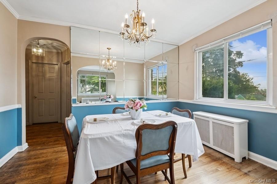 - Dining space featuring arched walkways, crown molding, wood finished floors, radiator, and plenty of natural light