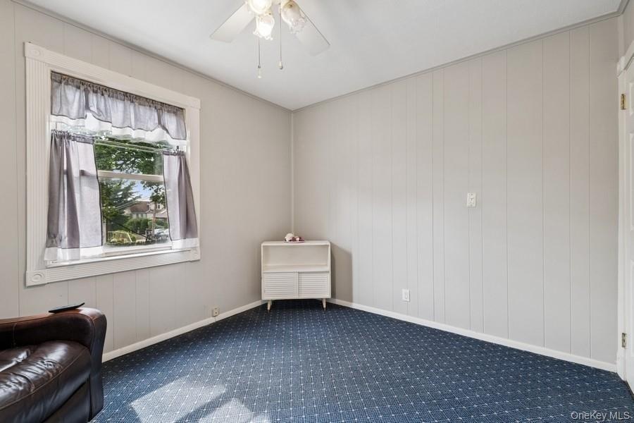 - Empty room with wood walls, a ceiling fan, and carpet flooring