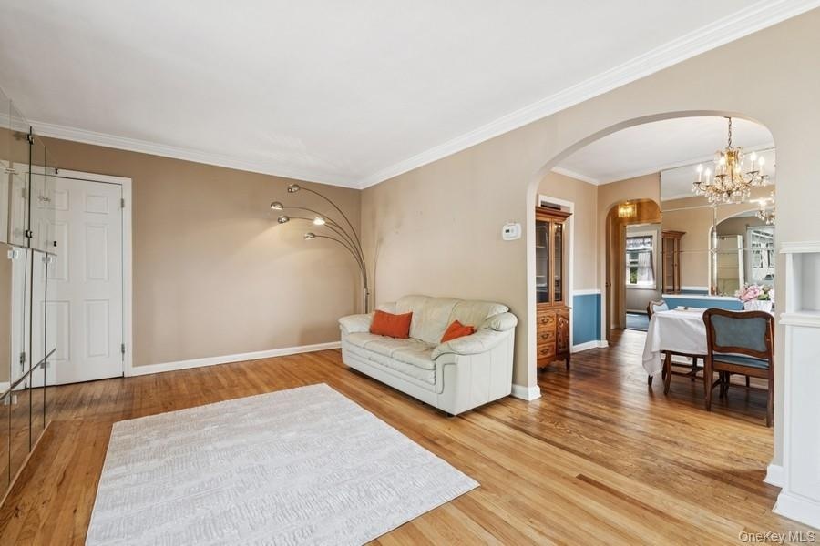- Living room featuring arched walkways, ornamental molding, wood finished floors, and a chandelier