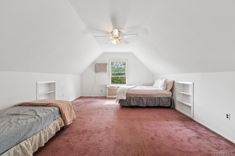- Bonus room featuring vaulted ceiling, radiator, carpet, and ceiling fan