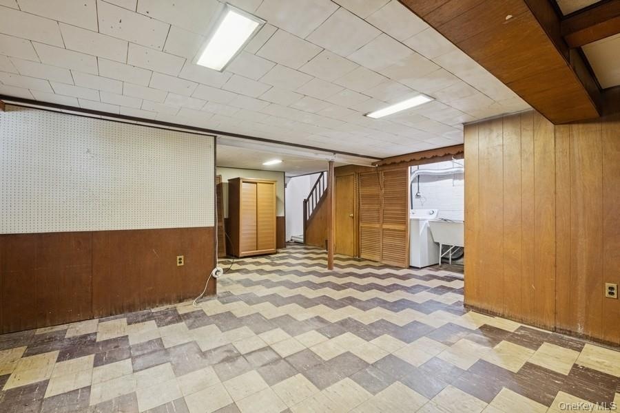 - Finished below grade area featuring wooden walls, tile patterned floors, washer / clothes dryer, stairway, and a wainscoted wall