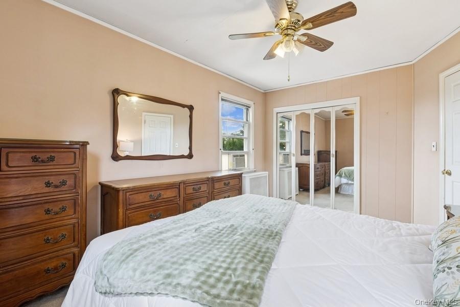 - Bedroom with ornamental molding, a closet, and ceiling fan