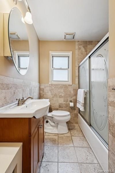 - Bathroom featuring vanity, a wainscoted wall, tile walls, tile patterned flooring, and bath / shower combo with glass door