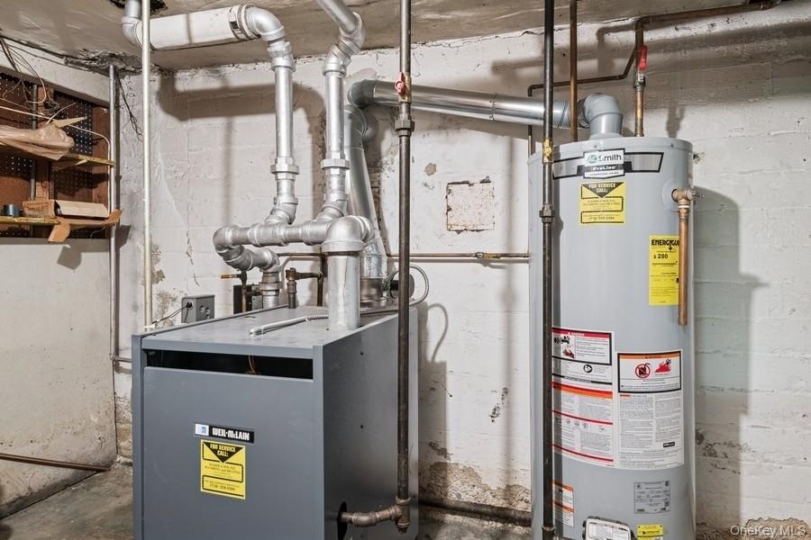 - Utility room featuring water heater and a heating unit