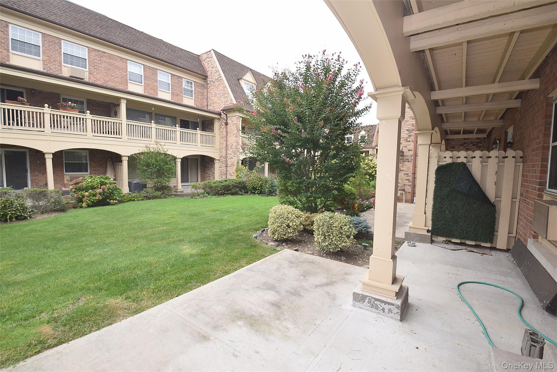 - Back of house featuring brick siding, a balcony, a yard, and a patio