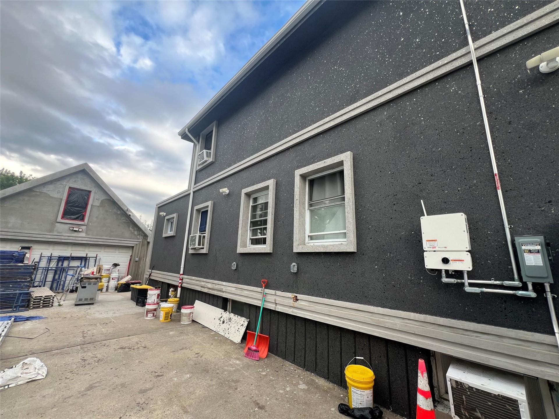 - View of home's exterior with an outbuilding, a garage, and stucco siding