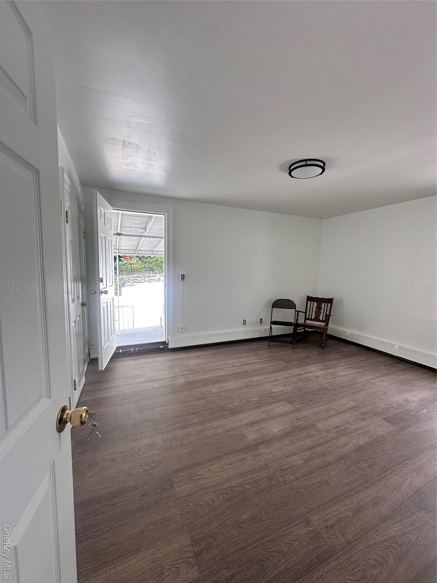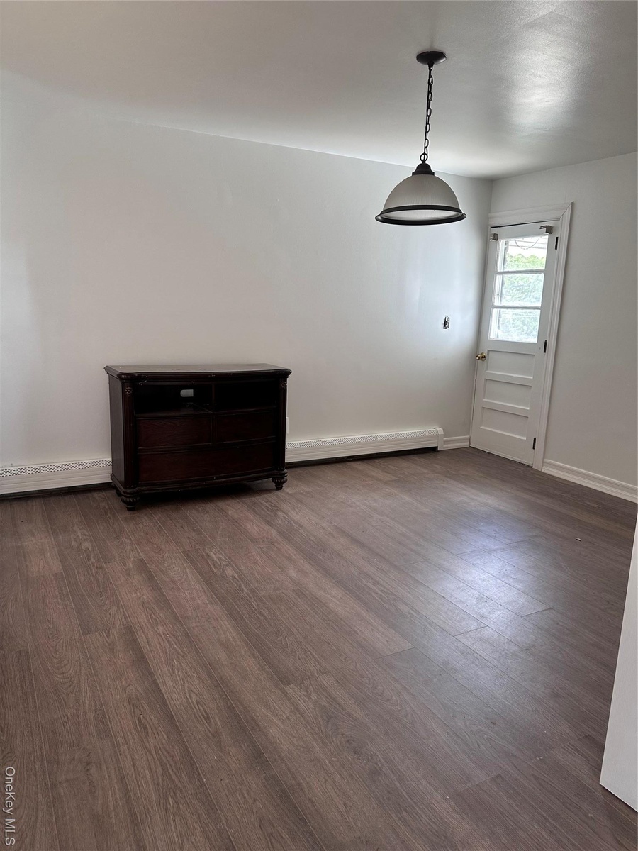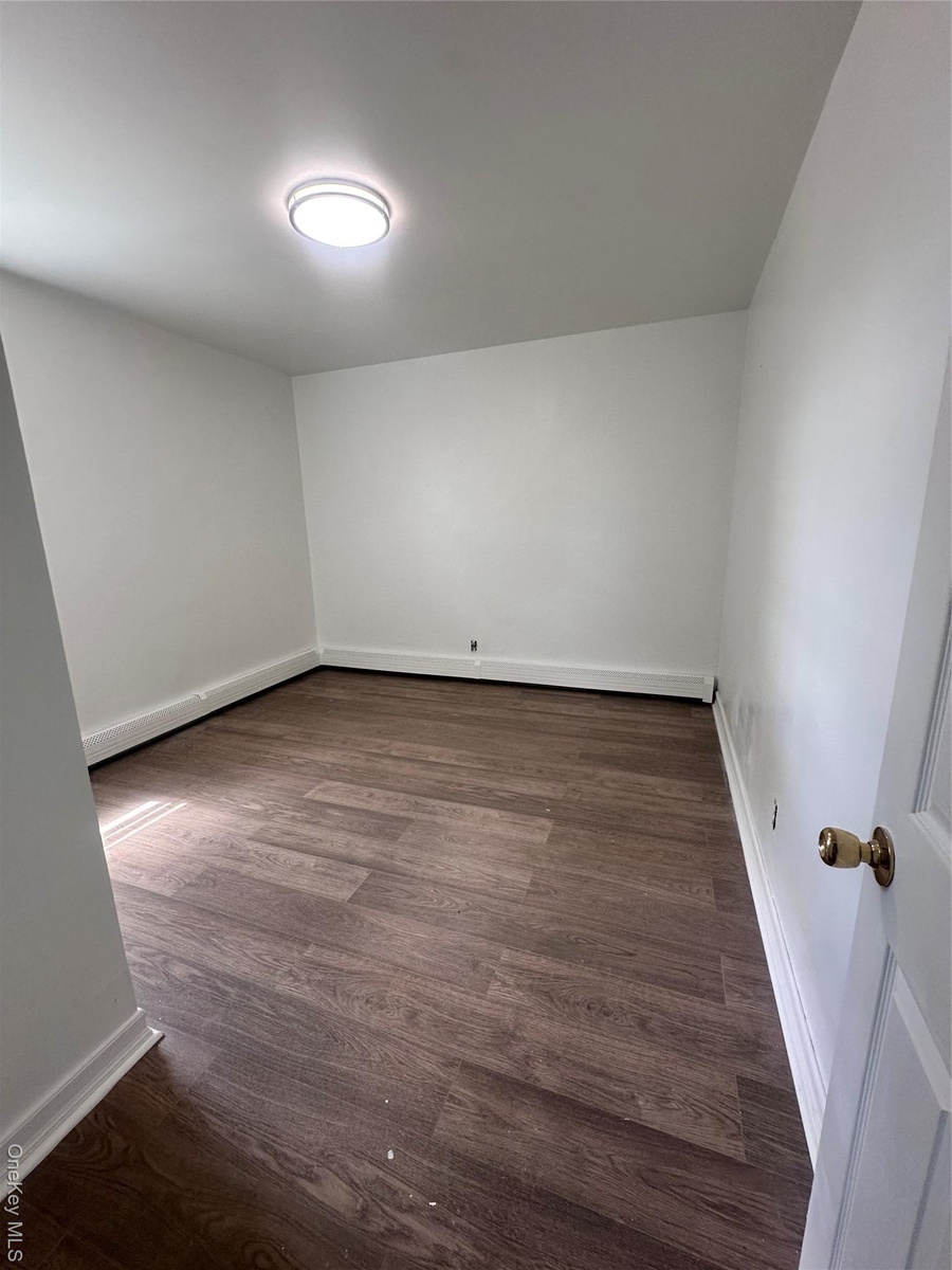 - Unfurnished room featuring dark wood-style floors and a baseboard heating unit