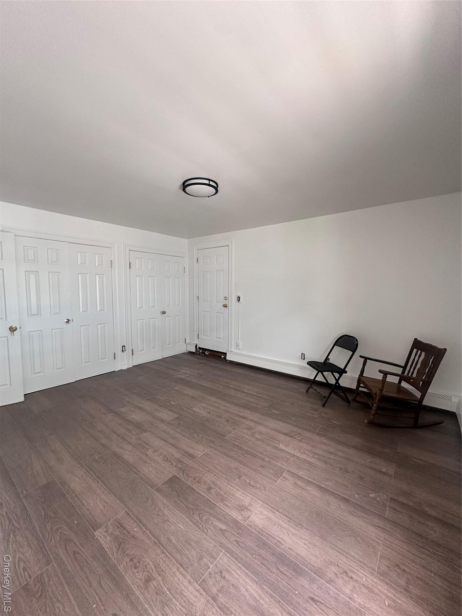 - Additional living space with dark wood-style flooring and a baseboard radiator