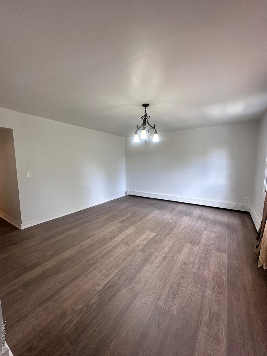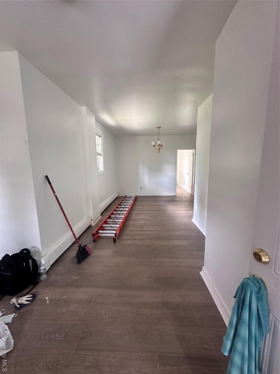 - Unfurnished living room with a chandelier, wood finished floors, and baseboard heating