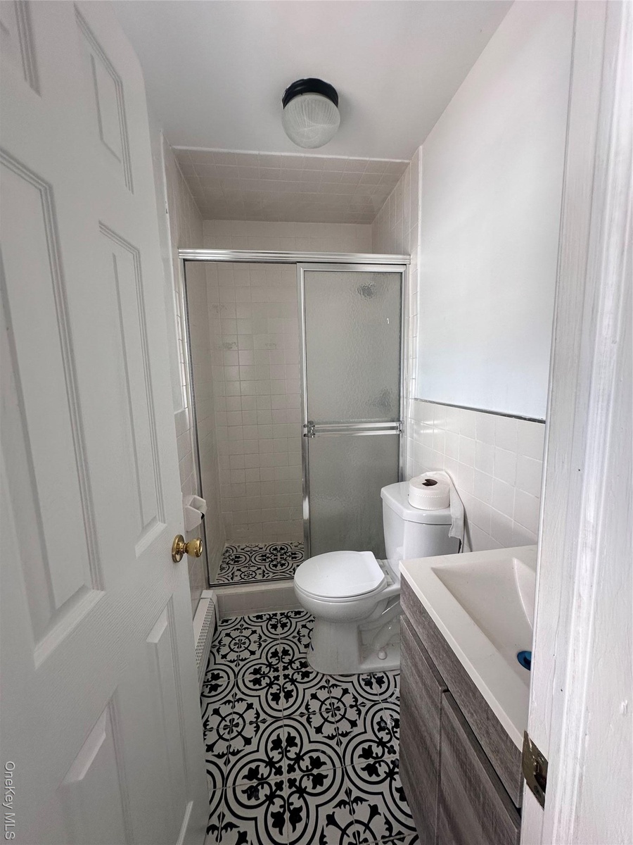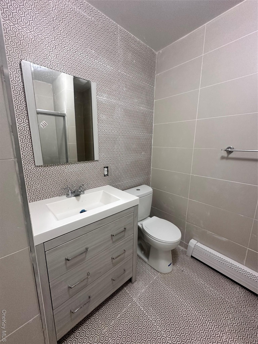 - Full bathroom with a baseboard heating unit, vanity, tile walls, a stall shower, and tile patterned floors
