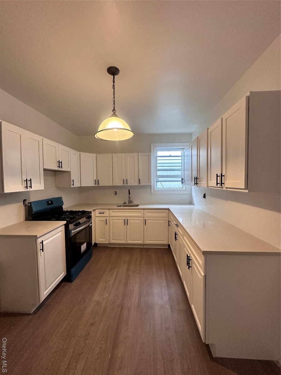 - Kitchen with range, dark wood-style flooring, white cabinets, and light countertops