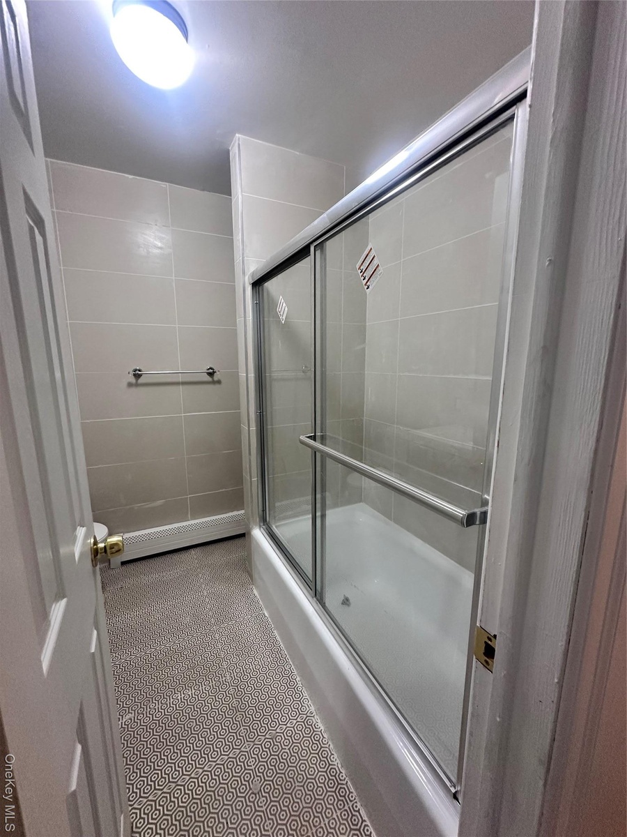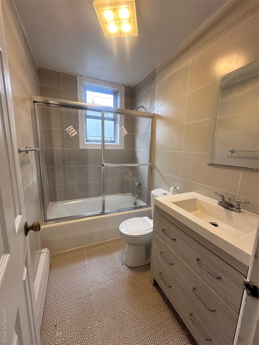 - Full bath with tile walls, vanity, shower / bath combination with glass door, and baseboard heating