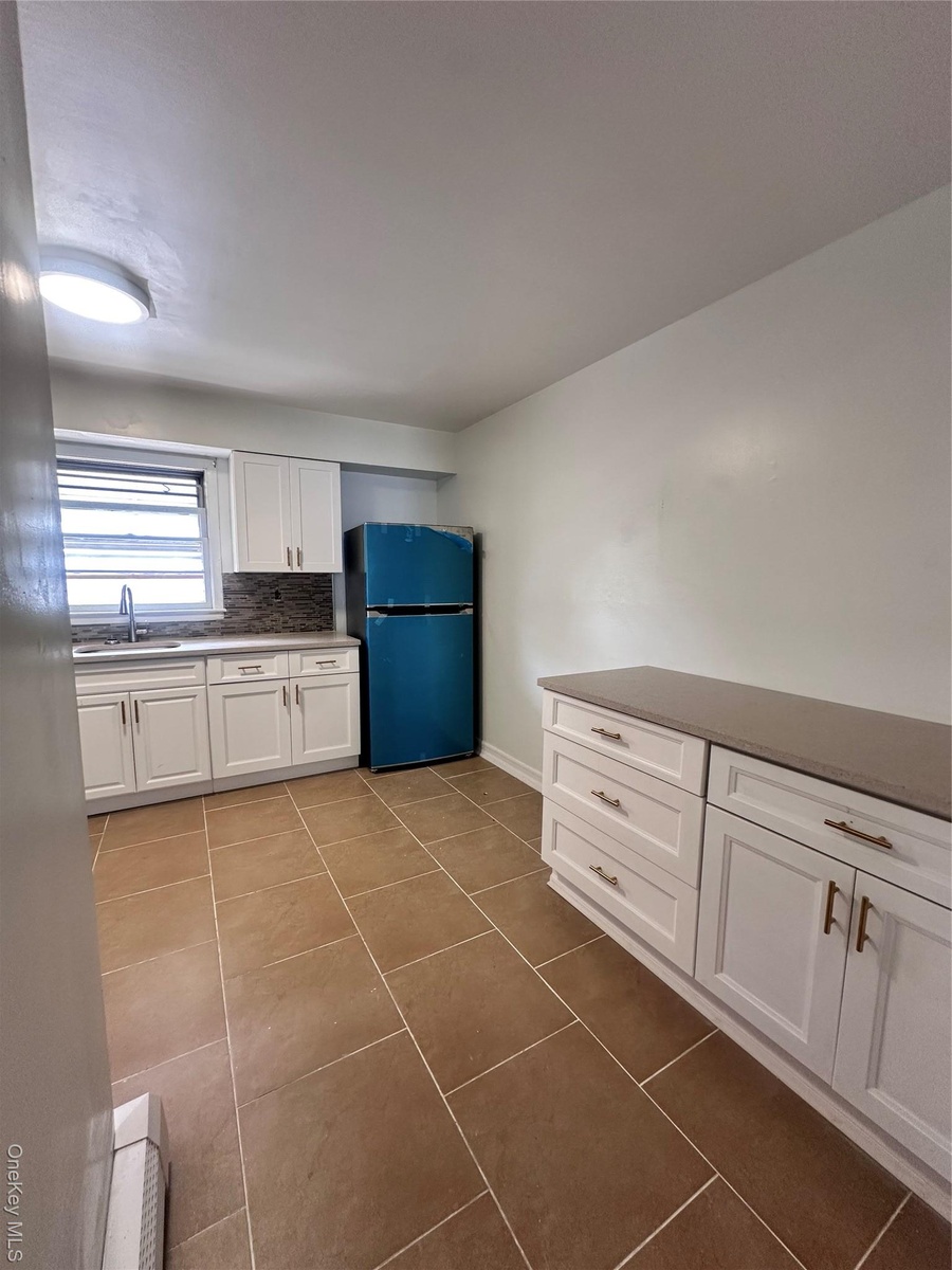 - Kitchen with fridge, light tile patterned floors, white cabinetry, decorative backsplash, and dark countertops