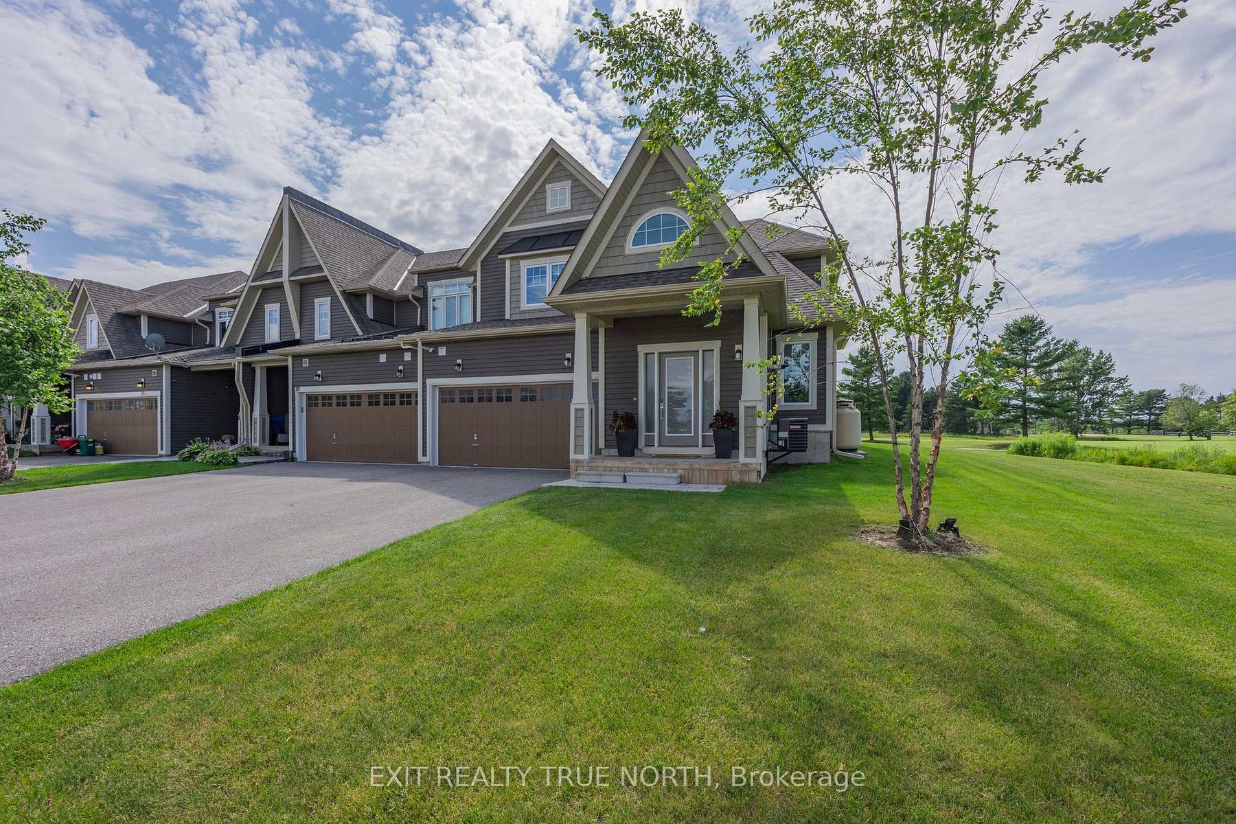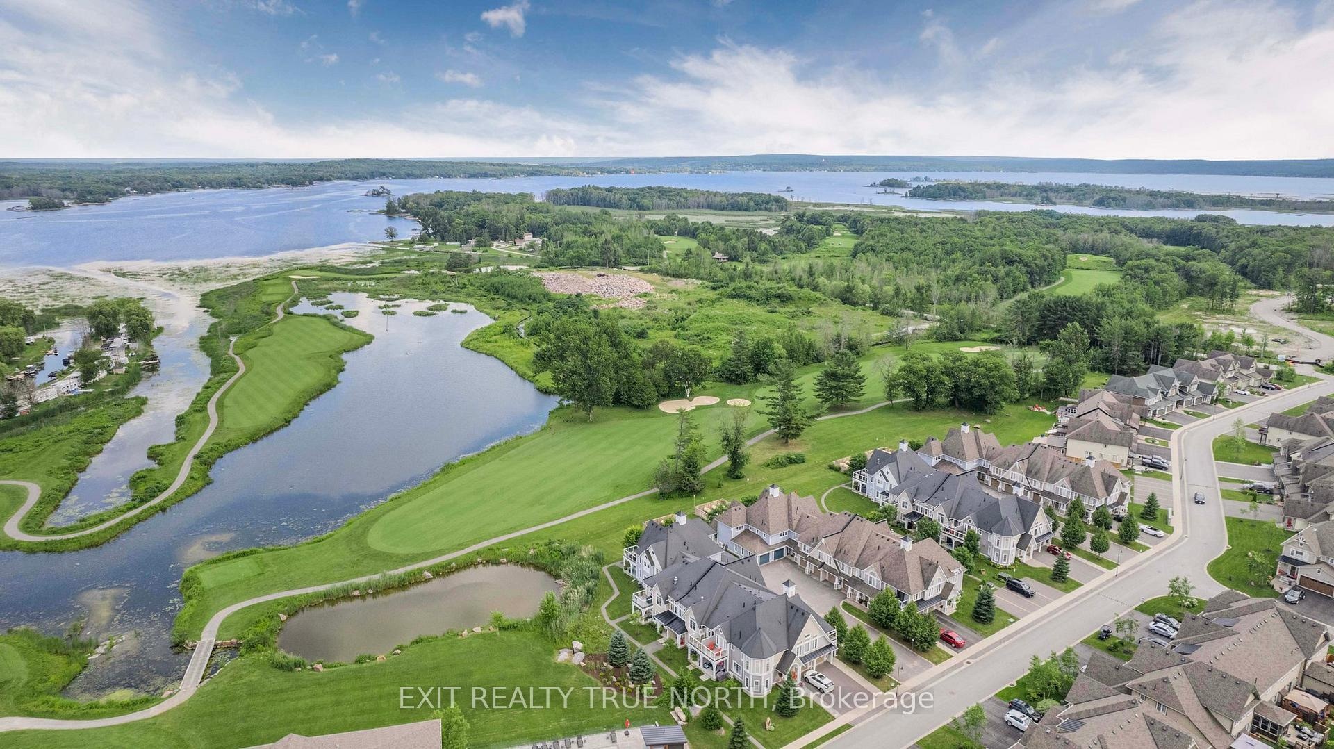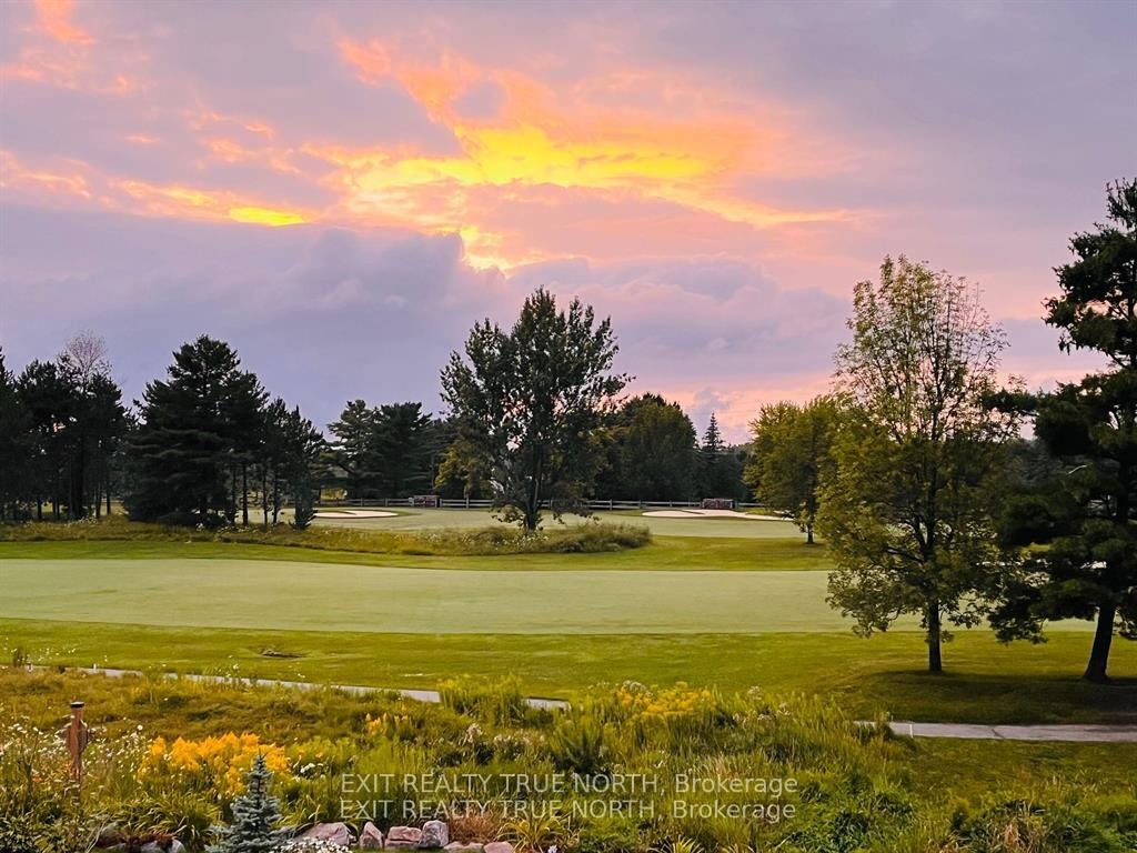 The highlight of the towns, this one was originally built for one of the development owners. A Freehold end unit with an unparalleled level of natural light, luxury and sophistication with top-to-bottom customization and high-end finishes. Literally a one-of-a-kind diamond in the community. No neighbors on one side! Main floor family room w. cathedral tray ceiling, luxury lighting, unobstructed breathtaking views of the 18th fairway and spectacular evening sunsets, 2 French door walk outs custom feature wall with convection electric fireplace. Main floor primary suite features french door walkout, large custom walk-in closet with built-ins, and luxurious en suite with oversized shower, dual shower heads, and a private "water closet". Chefs kitchen with gas stove, stainless steel appliances, pot filler tap, custom backsplash, floating shelving, wine fridge, serving counter, and large pantry with custom pull outs. Dining room is easily convertible into a fourth bedroom or an office, with recessed ceiling and pot lights. Second level family room & gorgeous custom laundry room. Additional highlights include pot lights & luxury lighting throughout the entire home, 6.5-inch baseboards with built-in electrical receptacles, hardwood floors throughout, custom Hunter Douglas blinds & an interior whole home air cleaner. A view to live for up the 18th Fairway from inside the house and from the back deck where you can also spend evenings taking in breath taking Georgian Bay Sunsets. Sprinkler system, large deck with private gazebo for your luxurious outdoor oasis. Long list of custom features is available & they must be seen in person to appreciate! This is about living your best life, whatever that is to you! Easy walks, biking, breathtaking views, boating, golfing, pickle ball, gathering with friends, dinner at the club house, laughs and more! Visit our web site for more information! Social membership applies for amenities.
