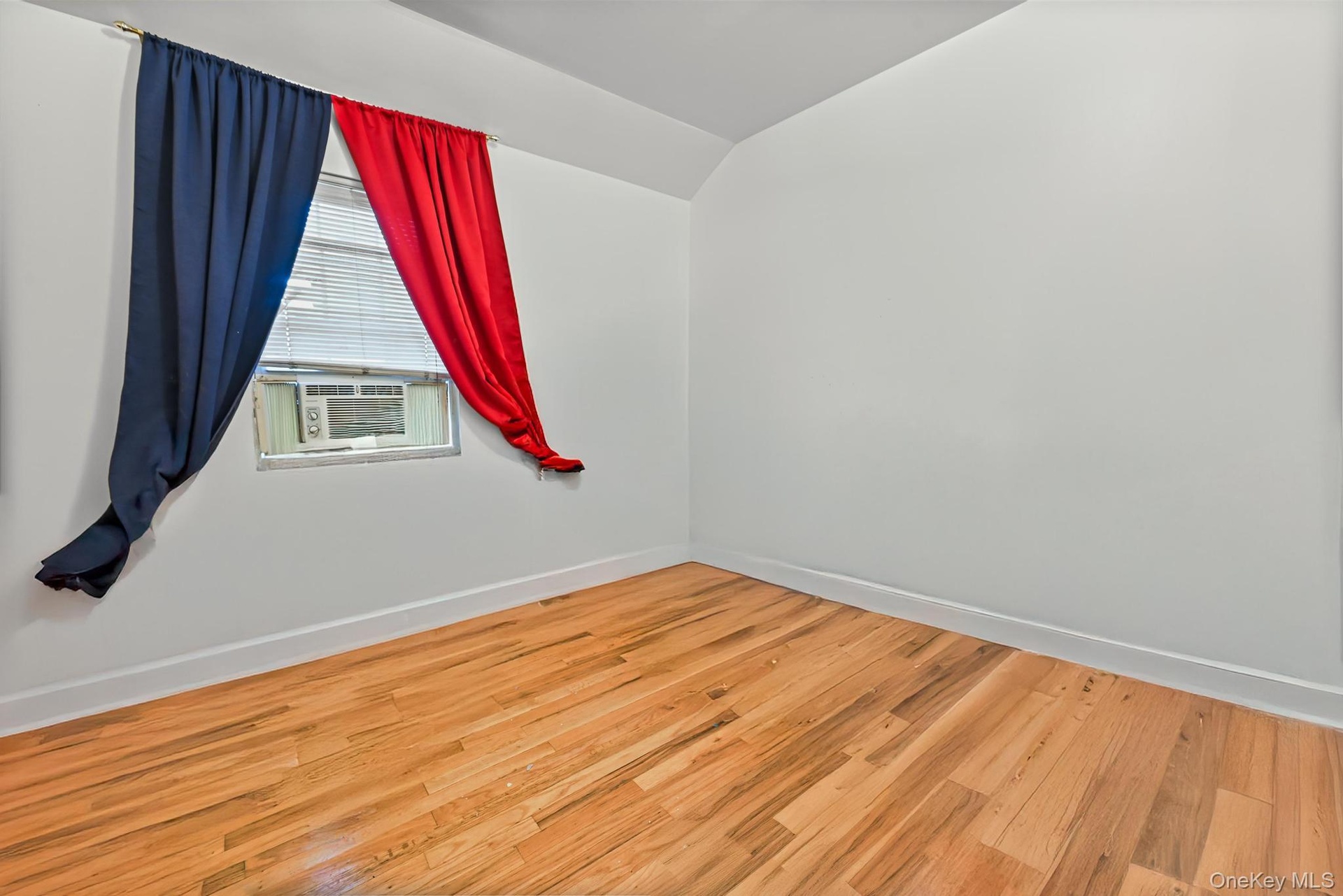 - Empty room with wood finished floors, vaulted ceiling, and cooling unit