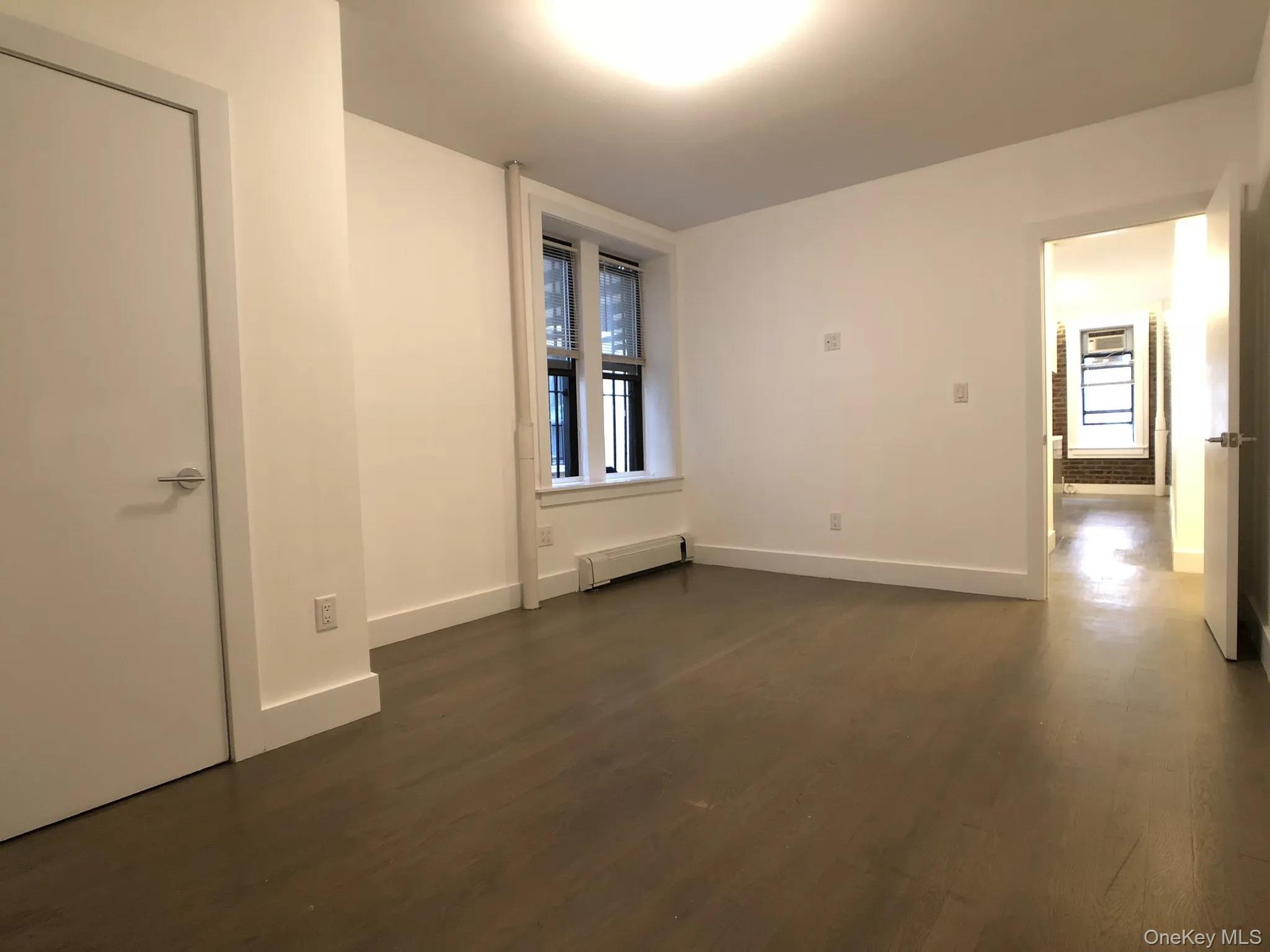- Unfurnished room with dark wood-type flooring and a baseboard radiator