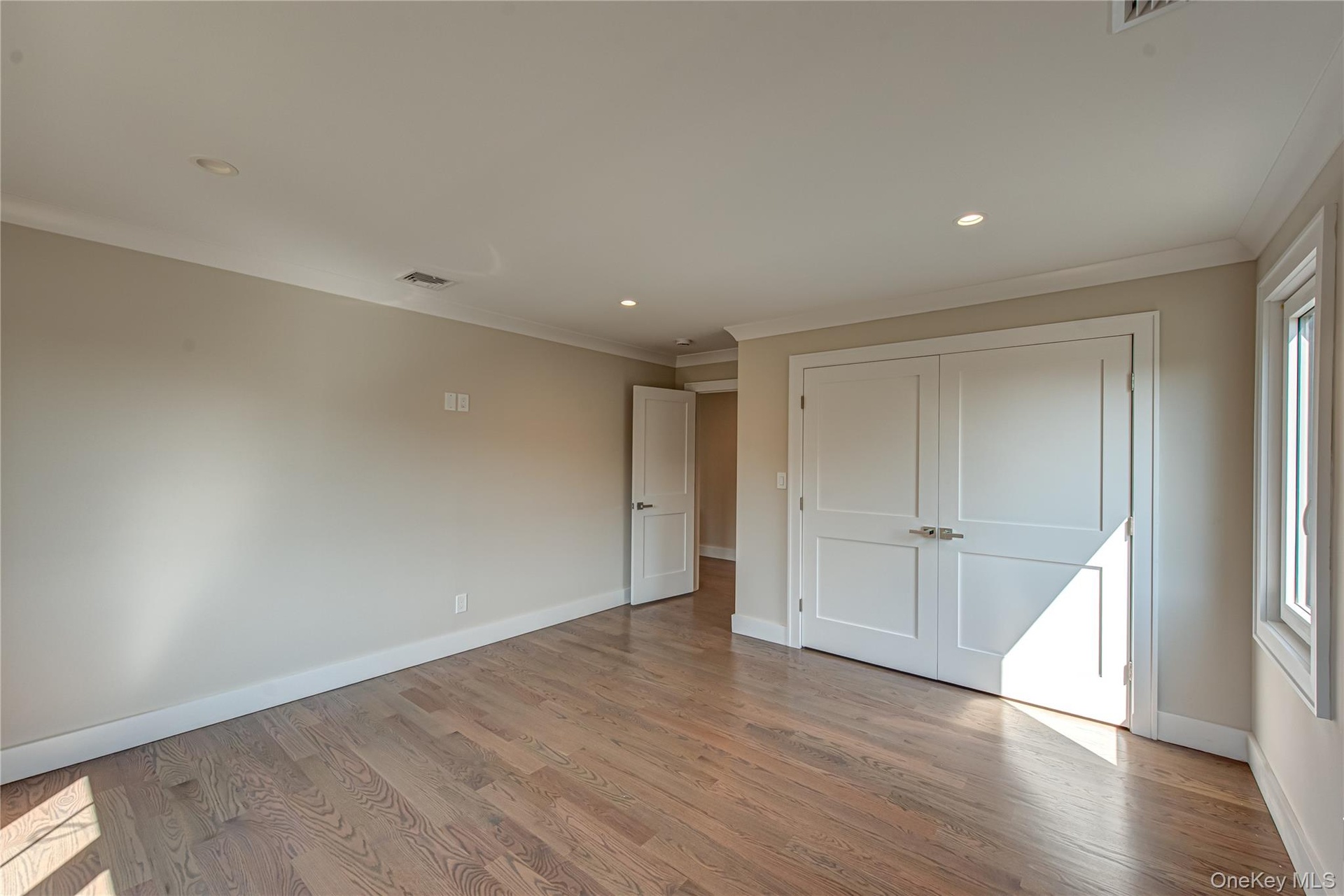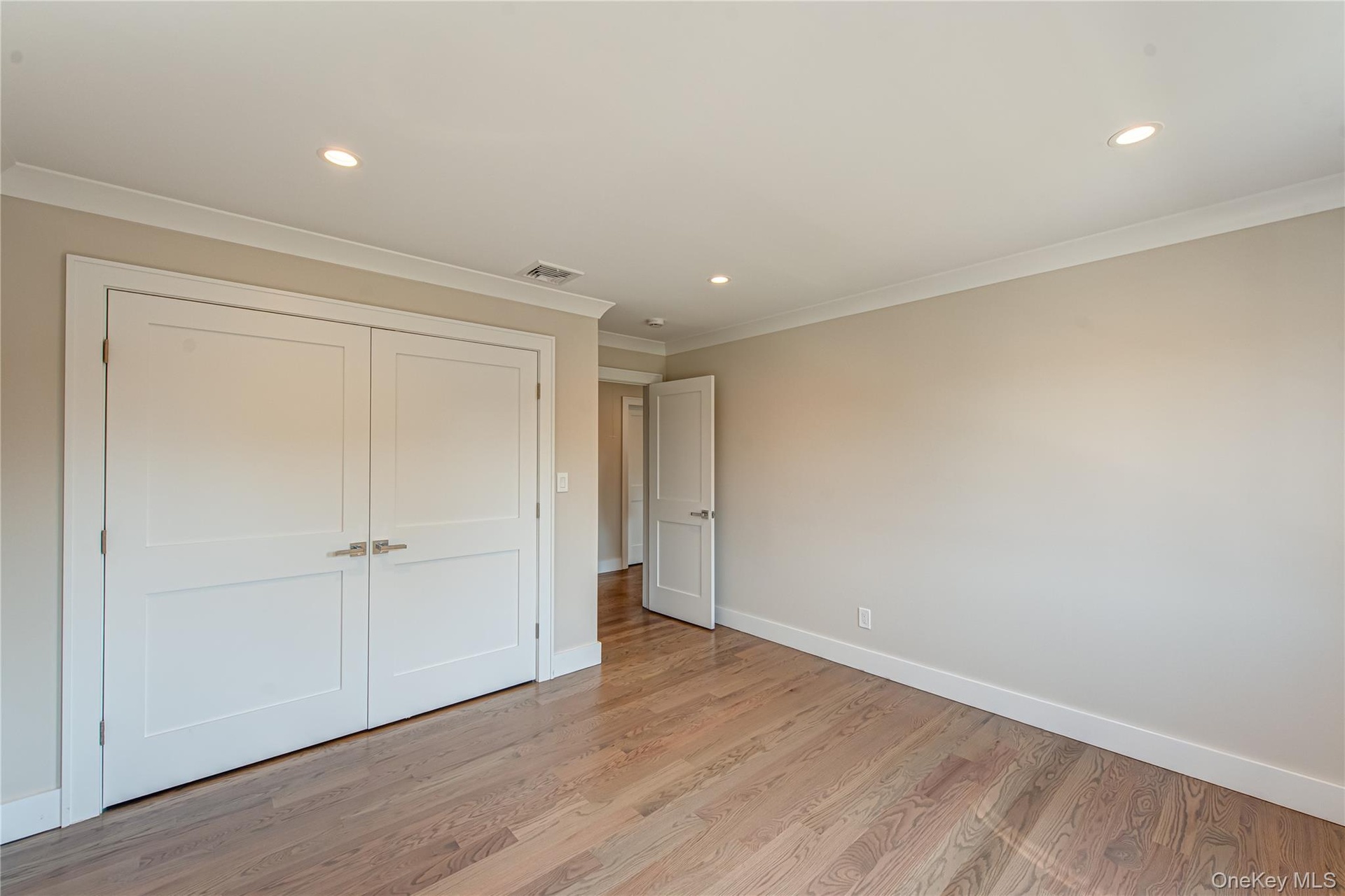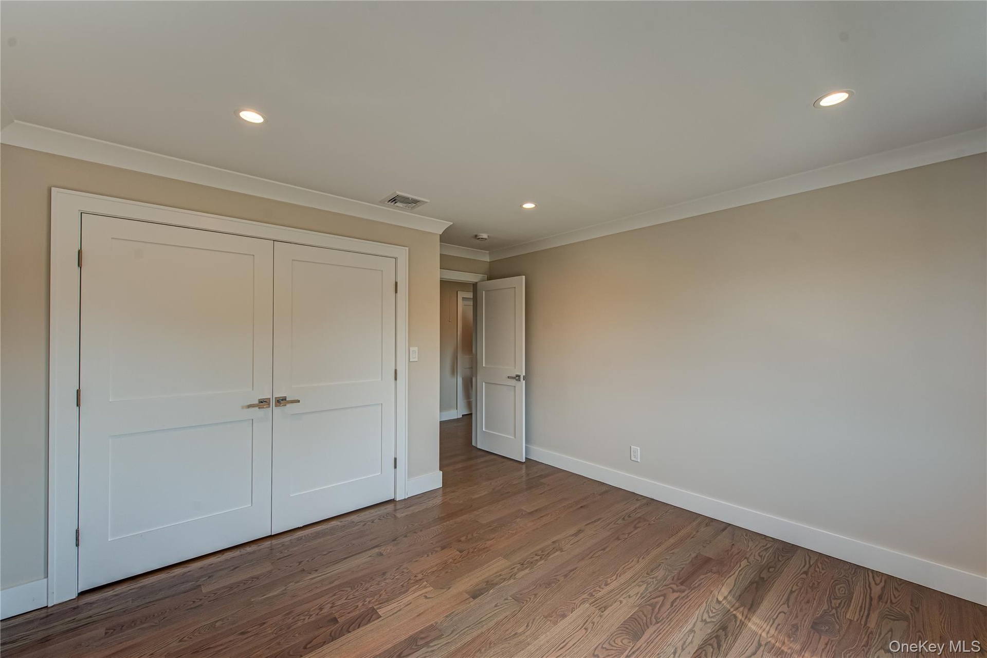 - Unfurnished bedroom featuring wood finished floors, a closet, recessed lighting, and ornamental molding