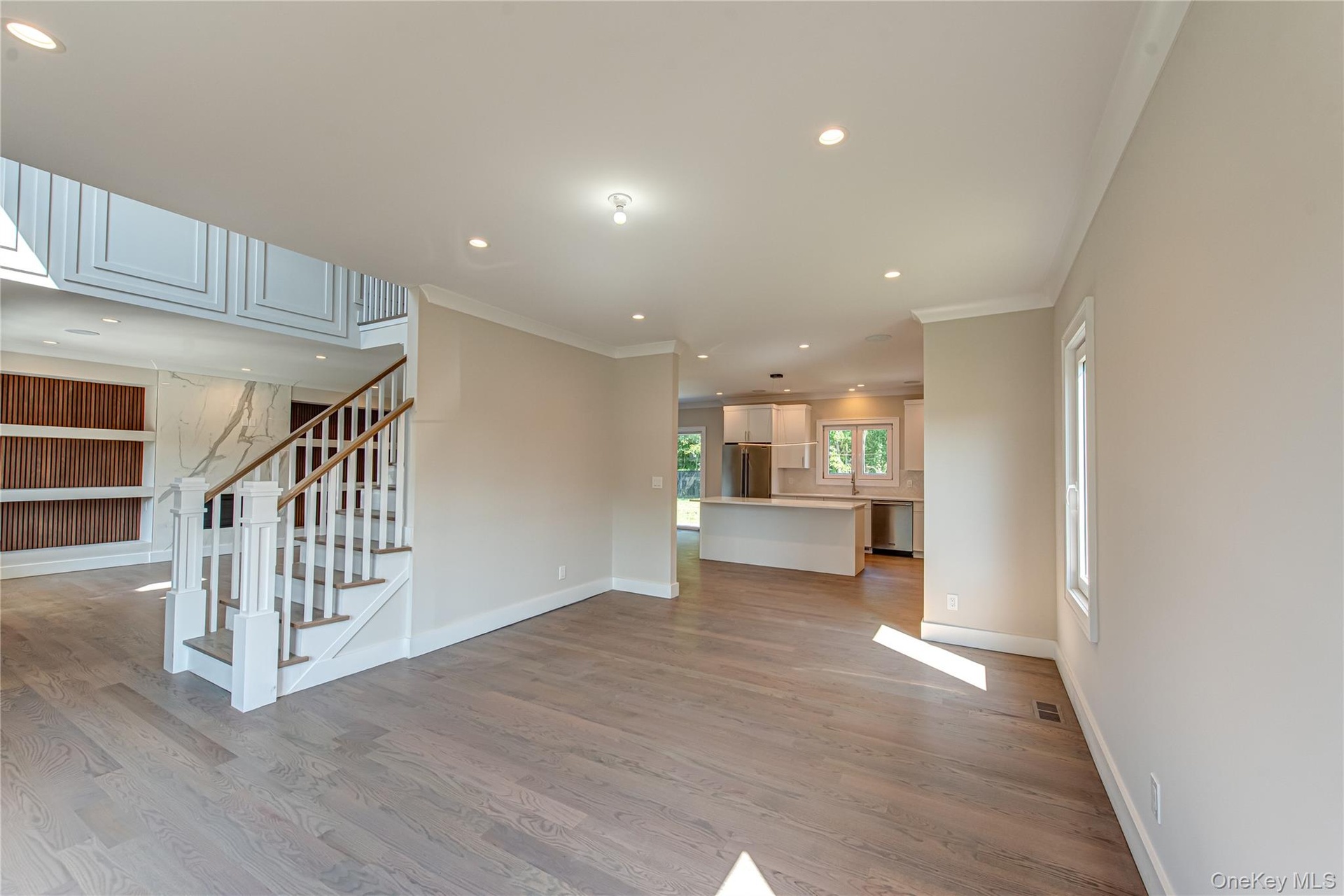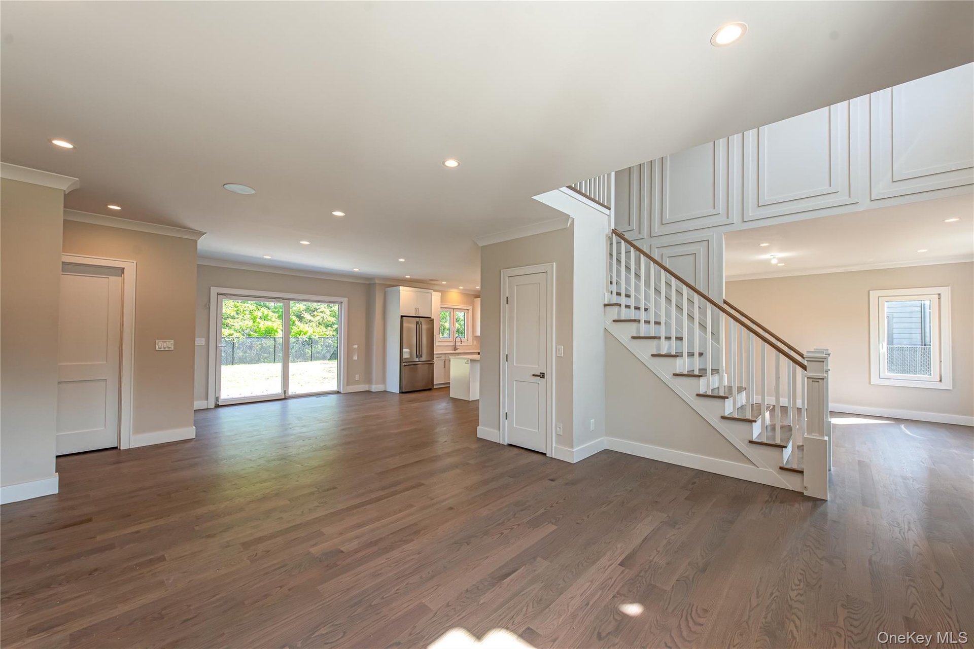 - Unfurnished living room featuring ornamental molding, stairway, wood finished floors, and recessed lighting