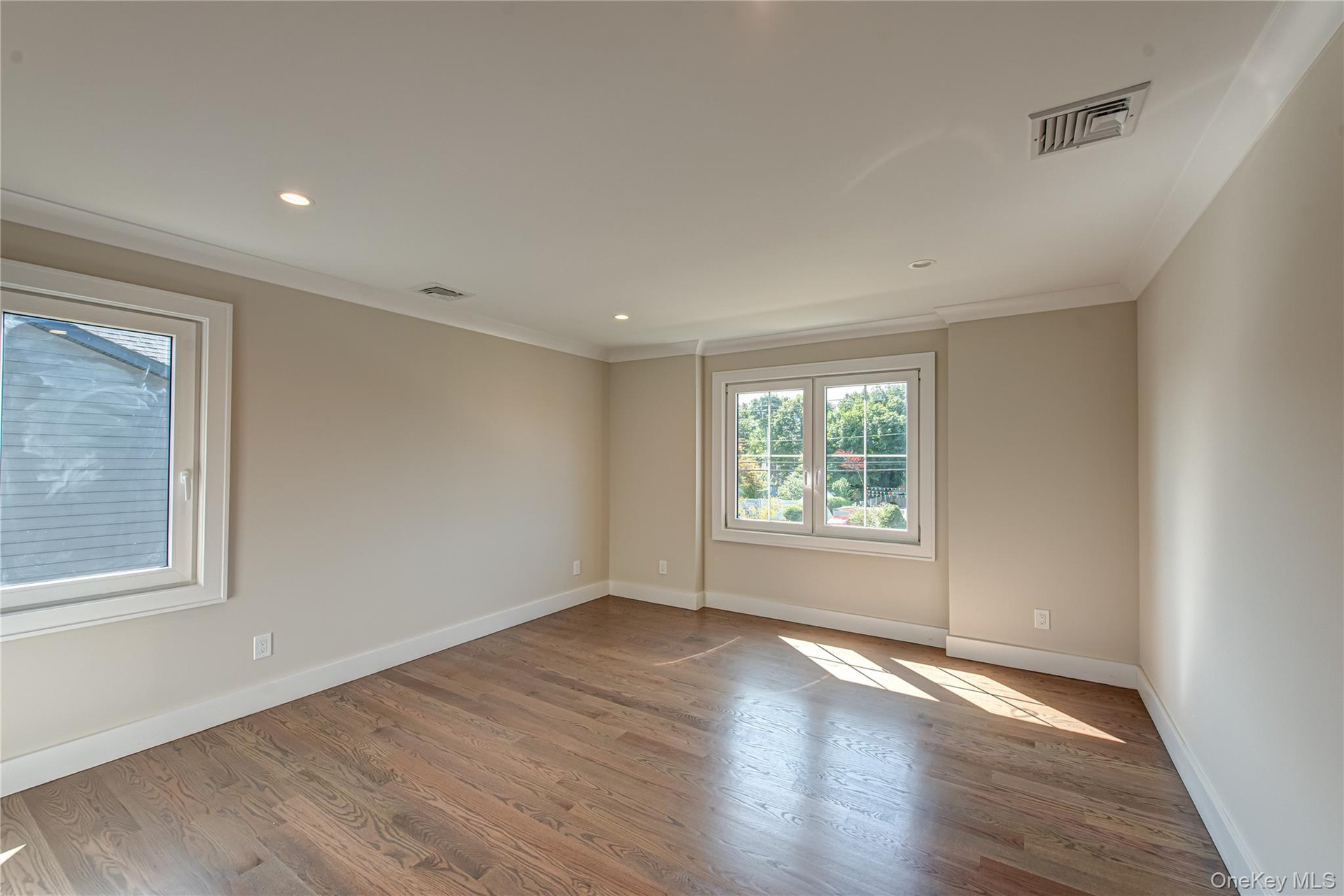 - Empty room featuring recessed lighting, wood finished floors, and crown molding