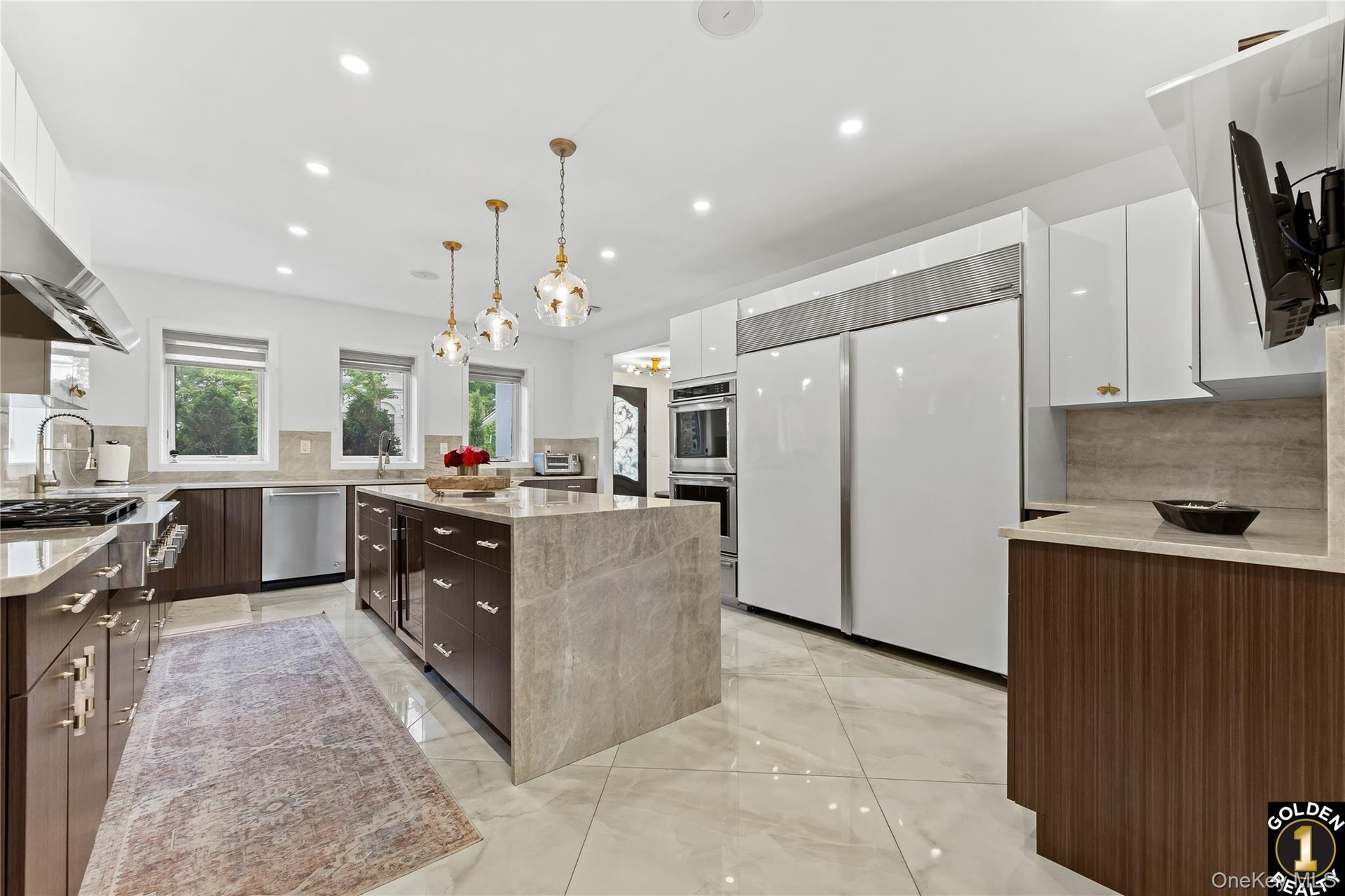 A central island offers abundant storage and houses a Sub-Zero mini fridge, and ample workspace—designed to inspire both casual meals and gourmet feasts.