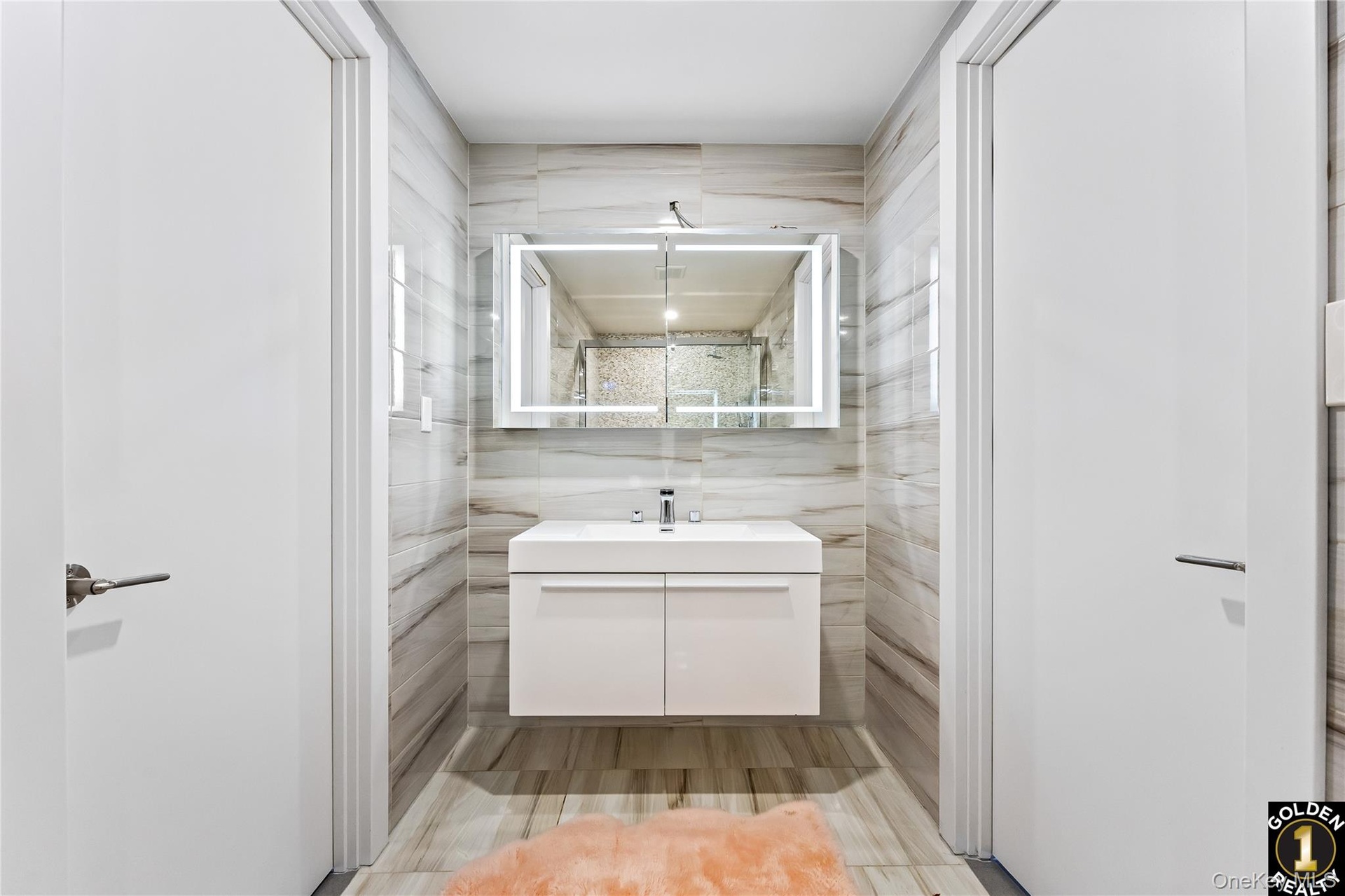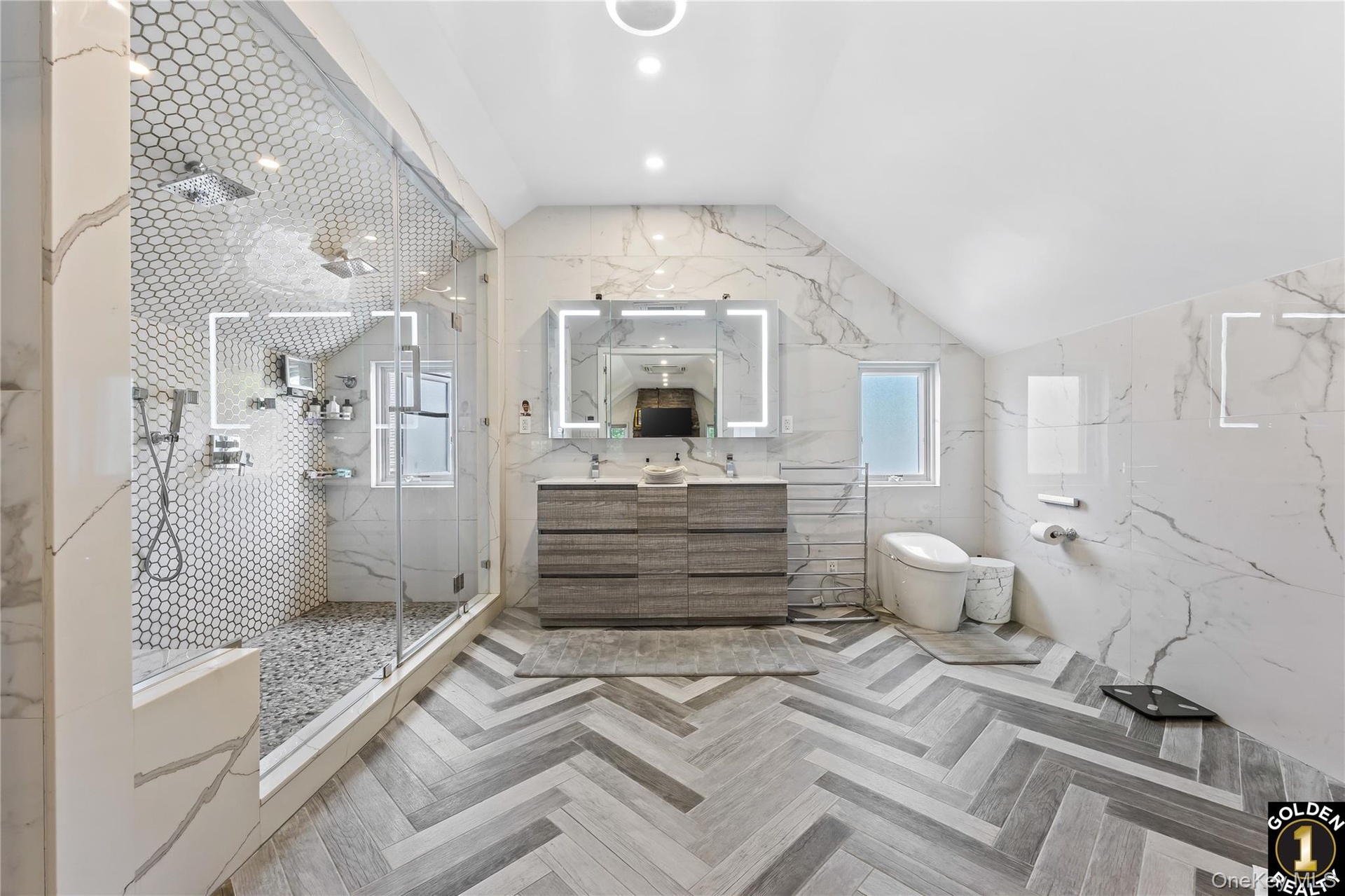 - Primary Bathroom Suite Front View featuring a marble finish shower, vanity, vaulted ceiling, and tile walls
