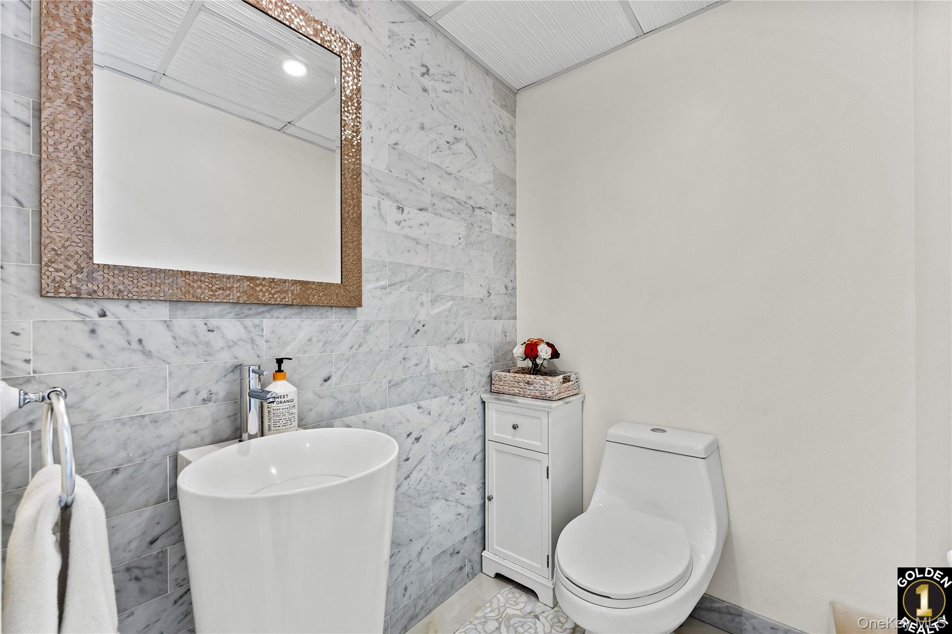- Bathroom with a marble finish shower, marble finish floors, and tile walls