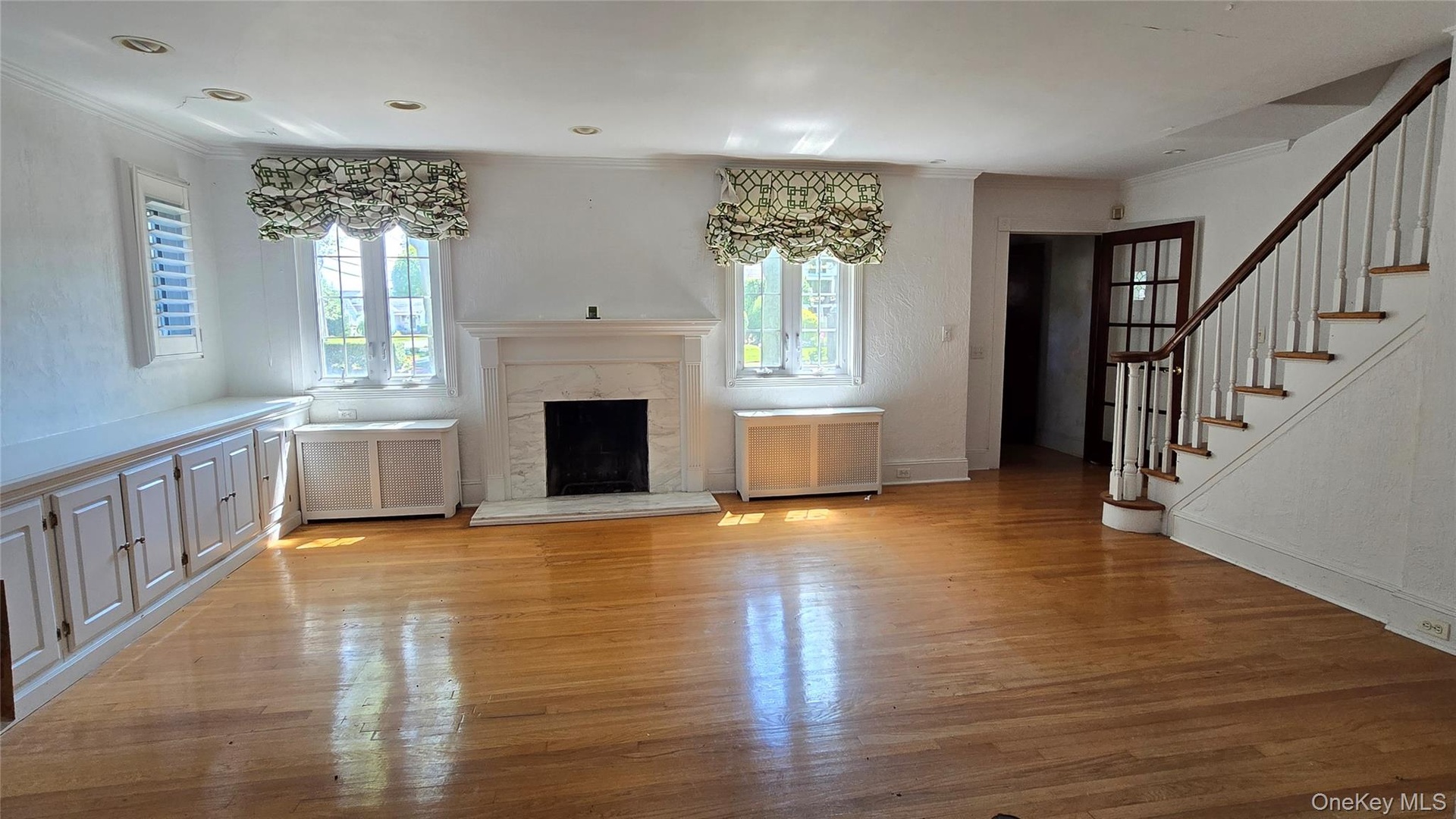 - Unfurnished living room featuring ornamental molding, radiator, light wood finished floors, healthy amount of natural light, and a premium fireplace