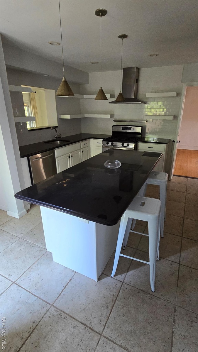 - Kitchen featuring dark countertops, white cabinetry, extractor fan, range, and backsplash