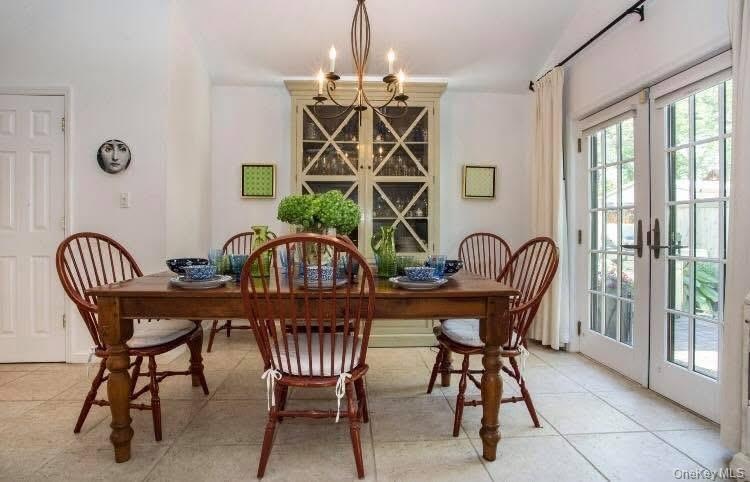 - Dining space with a chandelier, french doors, and light tile patterned flooring