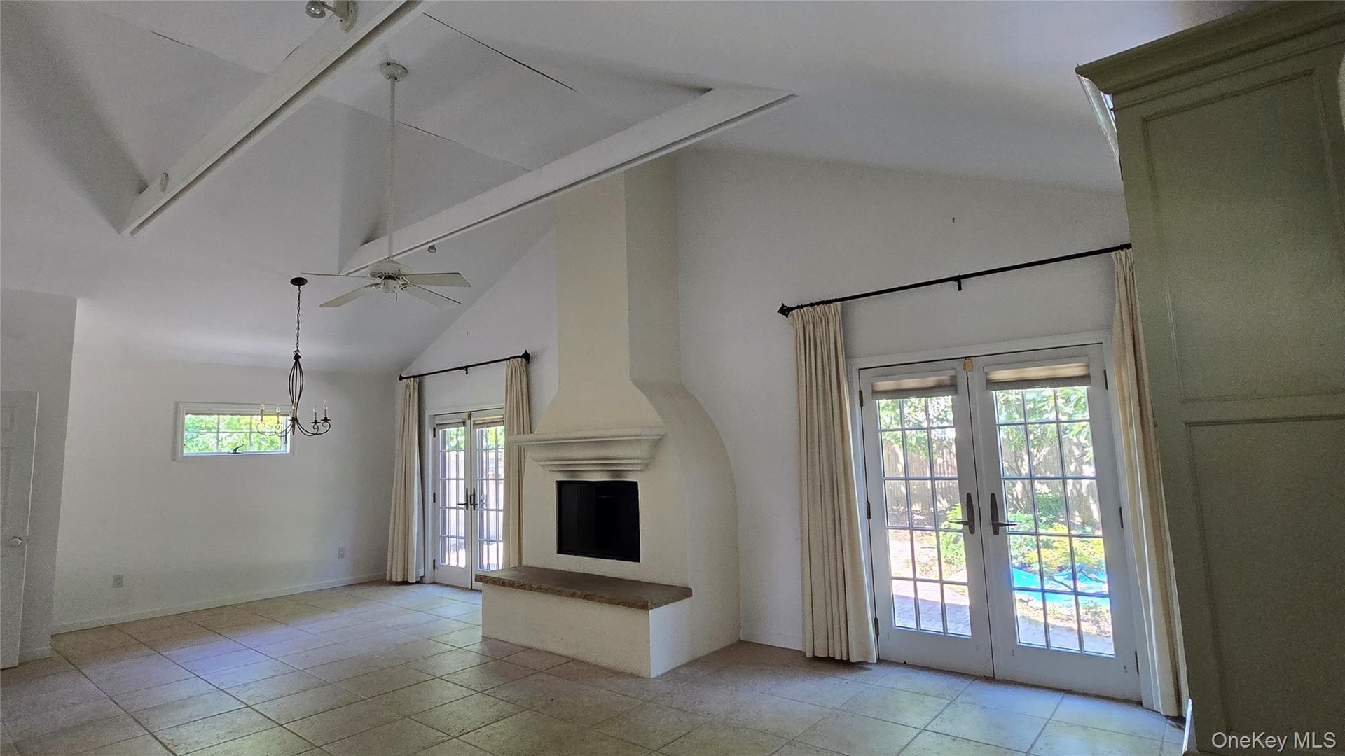 - Unfurnished living room featuring french doors, high vaulted ceiling, a large fireplace, ceiling fan, and light tile patterned floors