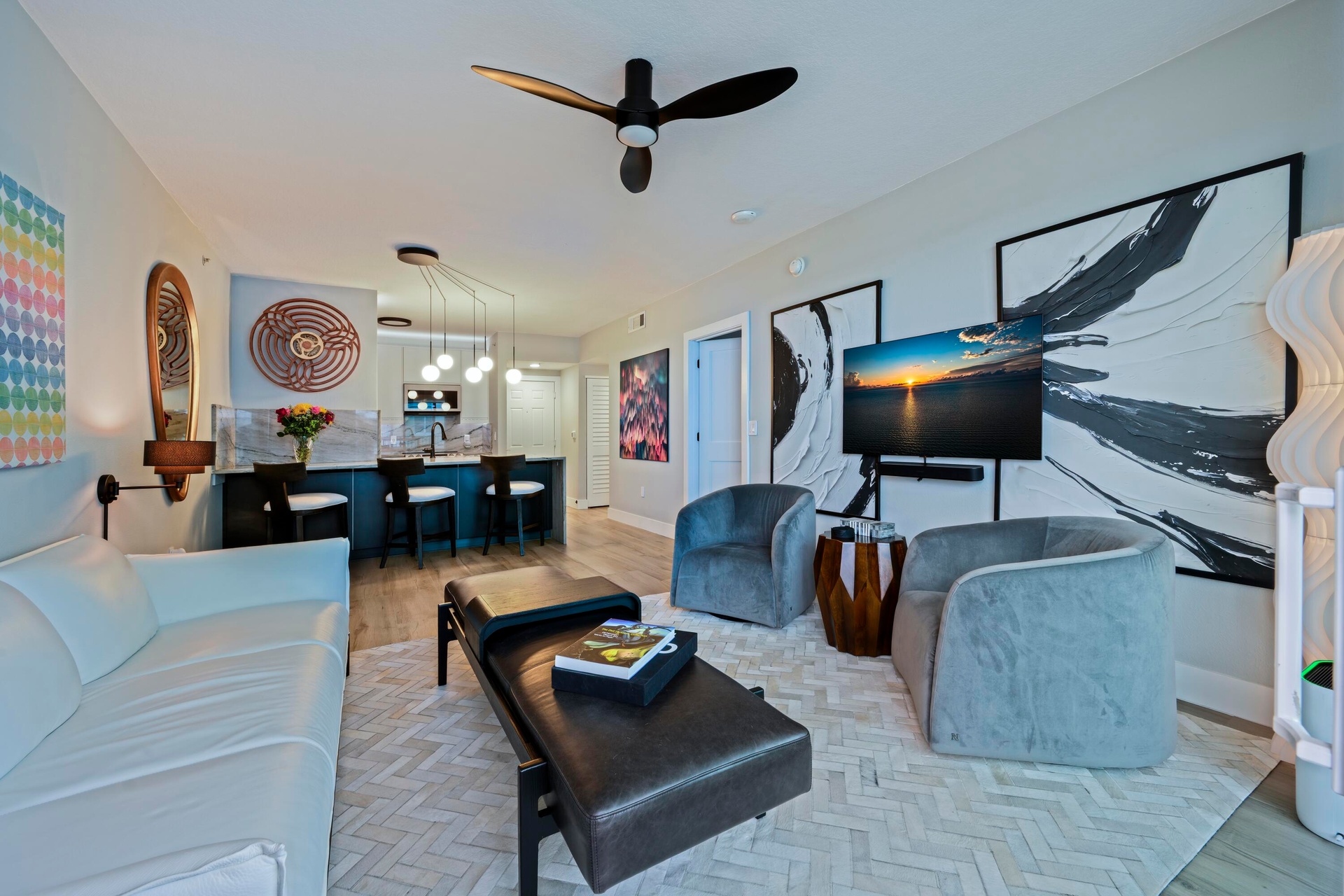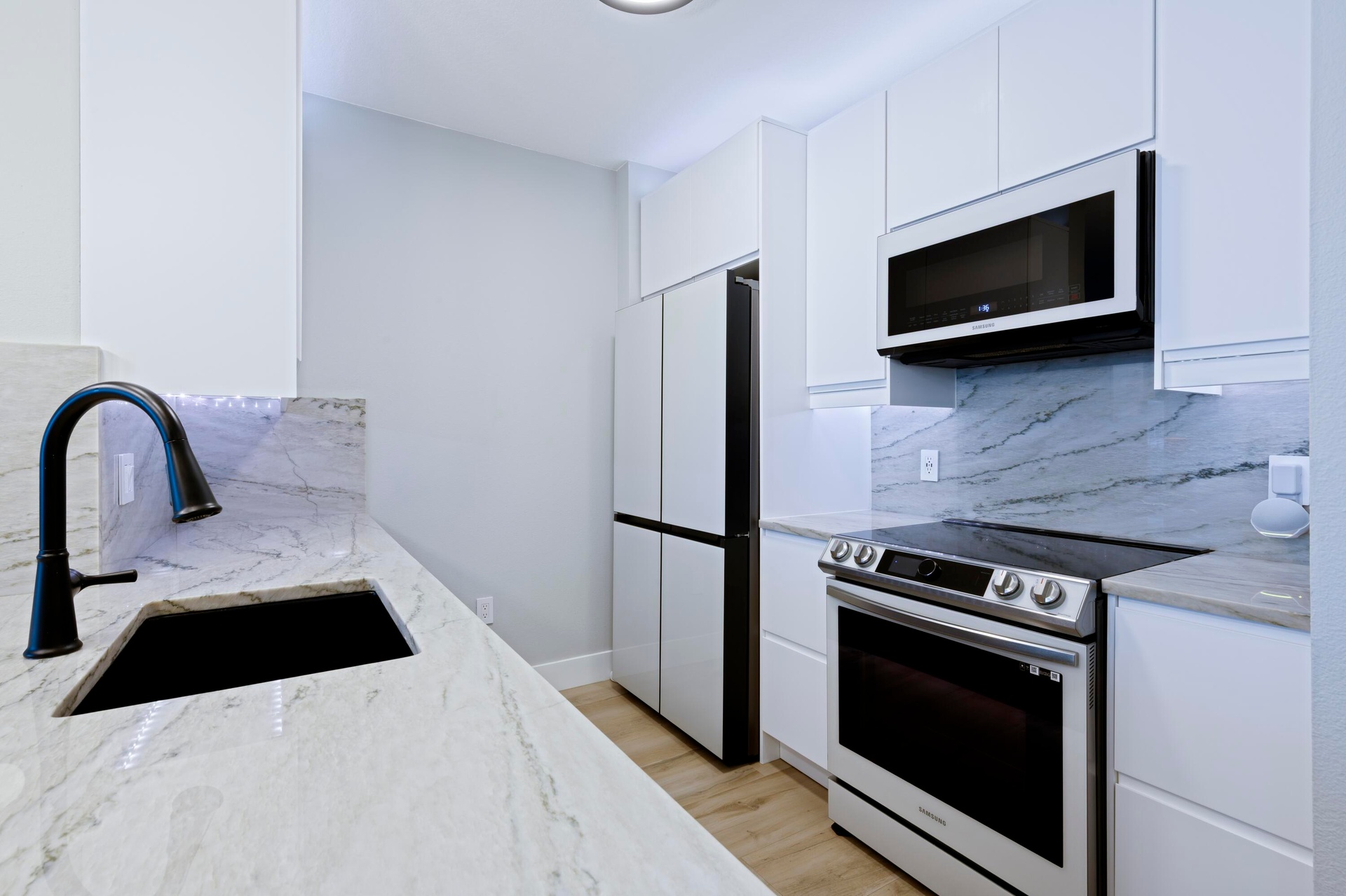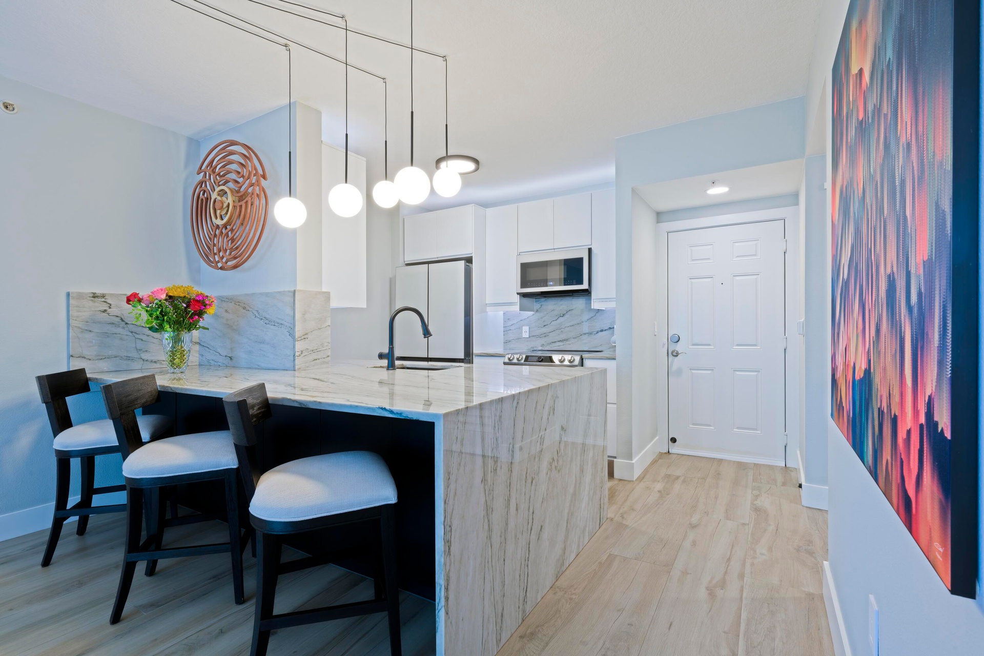 Beautiful, completely renovated condo with ocean and intracoastal views. Top to bottom renovation in late 2023. As soon as you enter this condo you will notice the large 60 inch porcelain wood plank tile floors. You will be welcomed by a modern sleek kitchen with gorgeous Quartzite counters and large waterfall edge that sets the tone for the rest of the home. The kitchen has modern white cabinets, smart home integrated Samsung appliances, plus cabinet and floorboard lighting. The high end renovation continues into the Primary bathroom with quartzite counters and custom vanity with additional cabinetry. The spa-like shower has floor to ceiling custom tile work, frameless glass doors, and a choice of shower heads. No detail was left untouched,