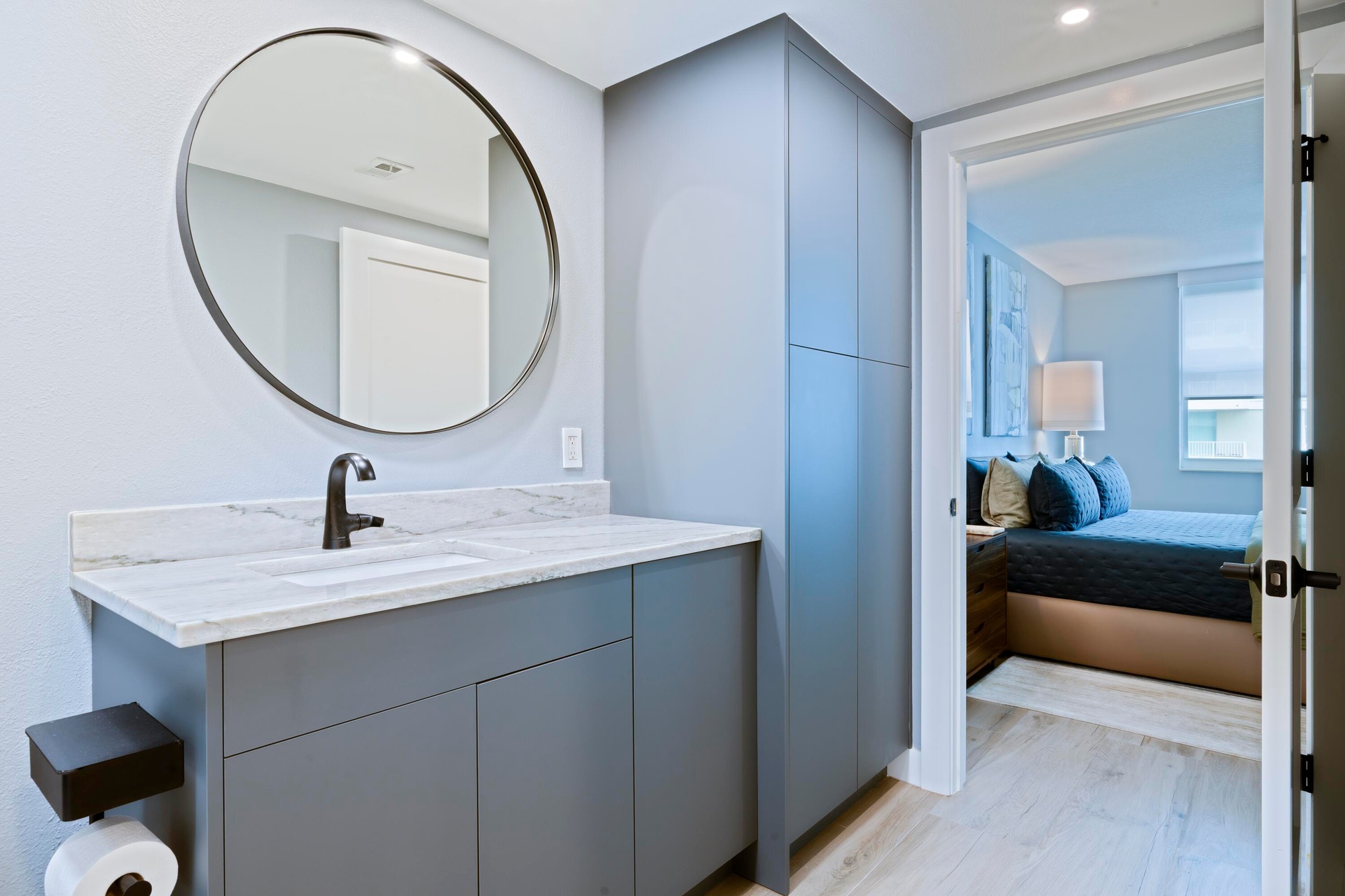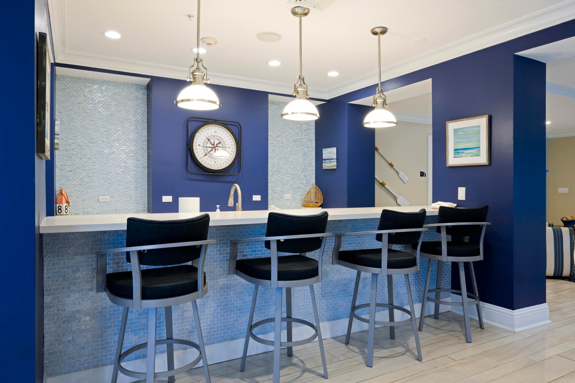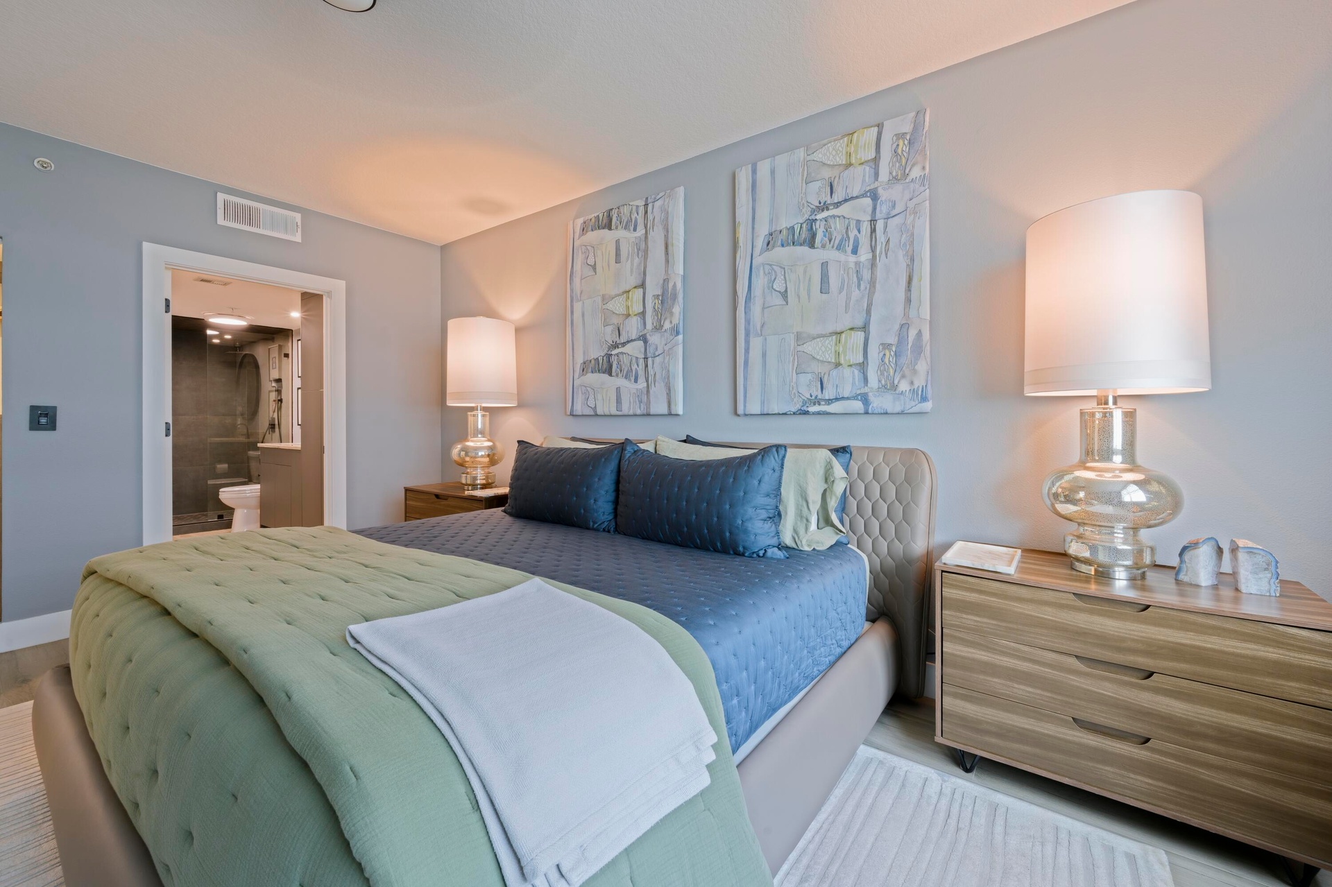 Beautiful, completely renovated condo with ocean and intracoastal views. Top to bottom renovation in late 2023. As soon as you enter this condo you will notice the large 60 inch porcelain wood plank tile floors. You will be welcomed by a modern sleek kitchen with gorgeous Quartzite counters and large waterfall edge that sets the tone for the rest of the home. The kitchen has modern white cabinets, smart home integrated Samsung appliances, plus cabinet and floorboard lighting. The high end renovation continues into the Primary bathroom with quartzite counters and custom vanity with additional cabinetry. The spa-like shower has floor to ceiling custom tile work, frameless glass doors, and a choice of shower heads. No detail was left untouched,