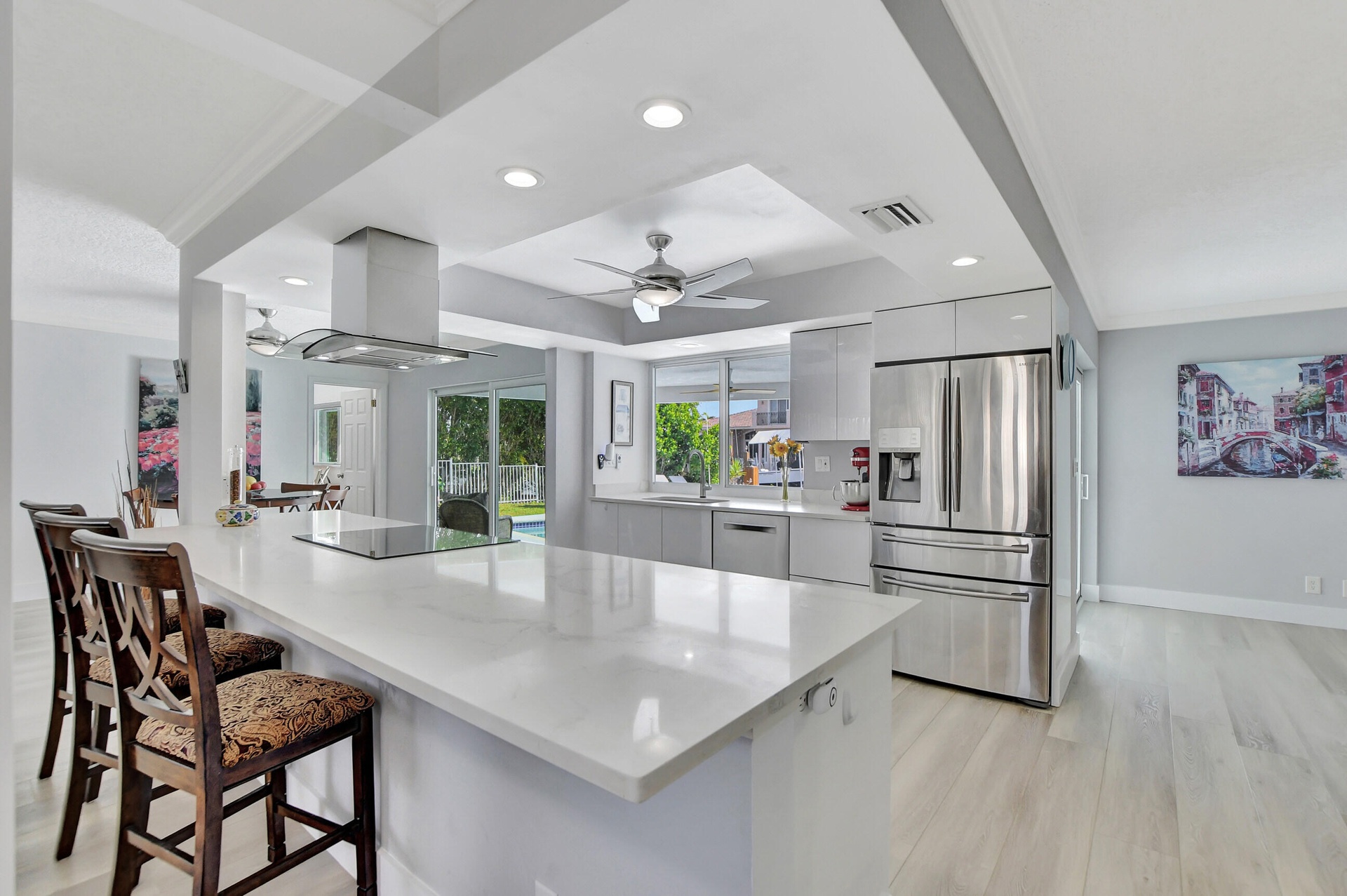 Embrace South Florida luxury in this remodeled ranch home with 85' of deepwater frontage, 60' dock, 13,000-lb boat lift, shore power, and no-fixed-bridge ocean access. Southern exposure delivers SE breezes and vibrant light. The open-concept layout boasts a sleek kitchen with a grand island, a dining area with a chic built-in bar, and a primary suite with serene water views, a spa-like bathroom, soaking tub, and shower. The split-bedroom design offers privacy. Move-in ready with CBS construction, 2023 metal roof, impact windows, 2022 AC, and appliances. Nestled in non-HOA Bel Marra, steps from Boca Raton and Delray's Atlantic Avenue, where lots fetch $2-2.5M. Your dream waterfront haven awaits!