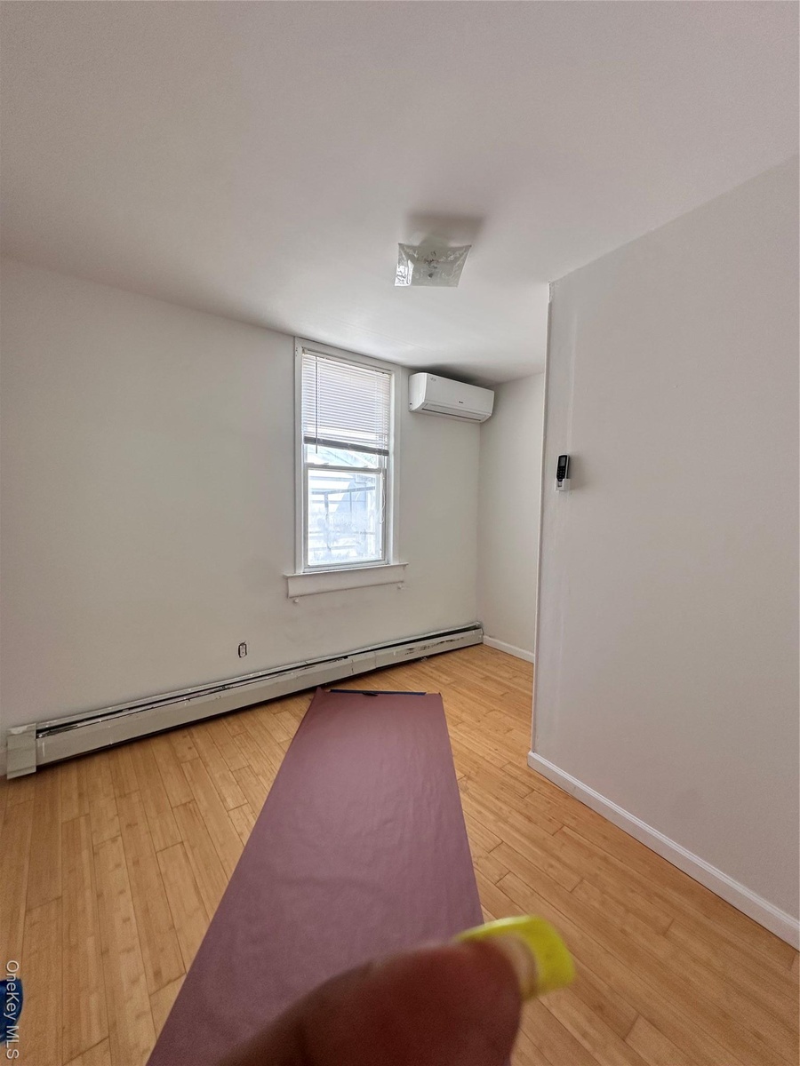 - Spare room with baseboard heating, light wood-type flooring, and an AC wall unit
