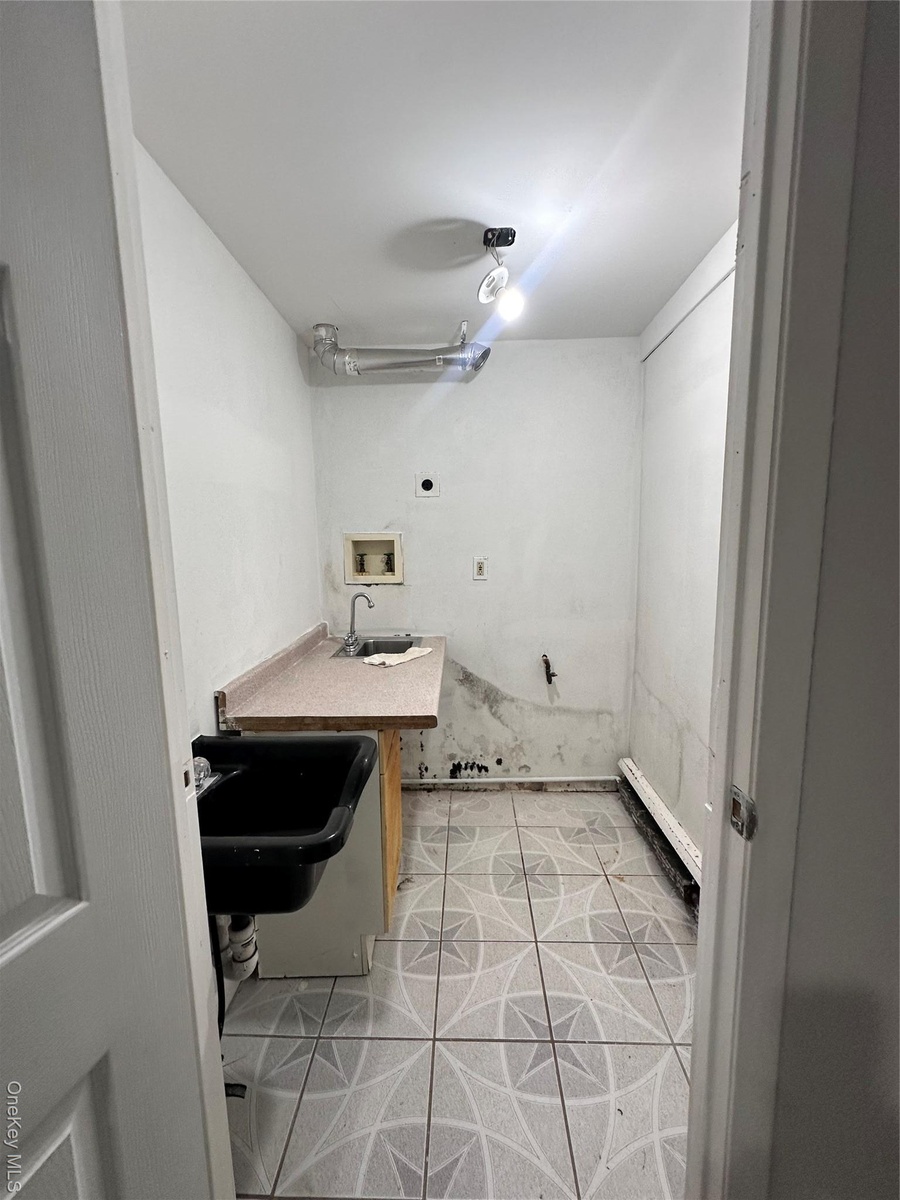 - Laundry area with hookup for an electric dryer, hookup for a washing machine, light tile patterned flooring, and a baseboard heating unit