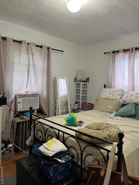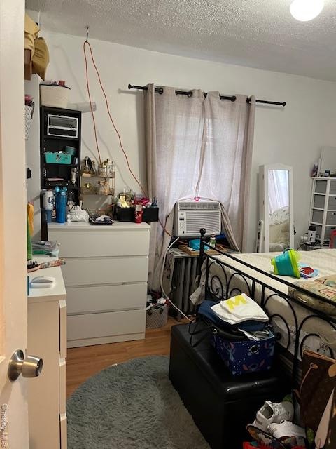 - Bedroom with wood finished floors, a textured ceiling, and cooling unit