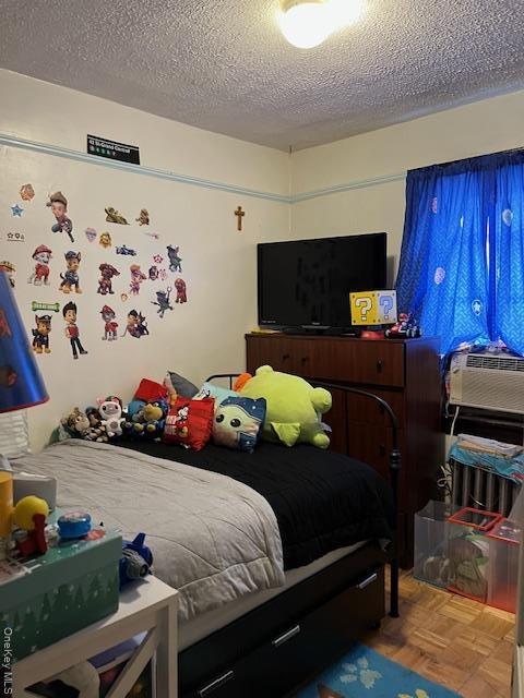 - Bedroom featuring a textured ceiling and cooling unit
