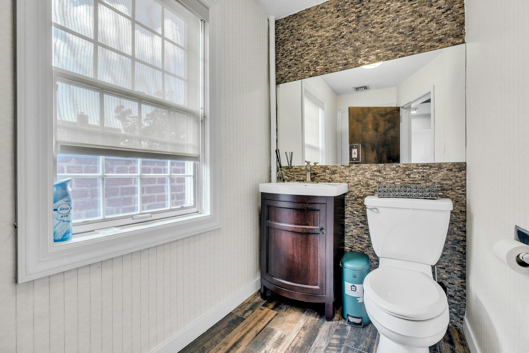 - Half bath featuring wood finished floors, vanity, and wallpapered walls