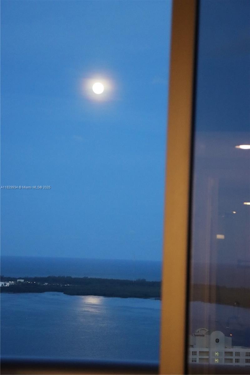- Elevated views showcase the shimmering moonrise over Biscayne Bay — a tranquil nighttime panorama framed by the city lights.