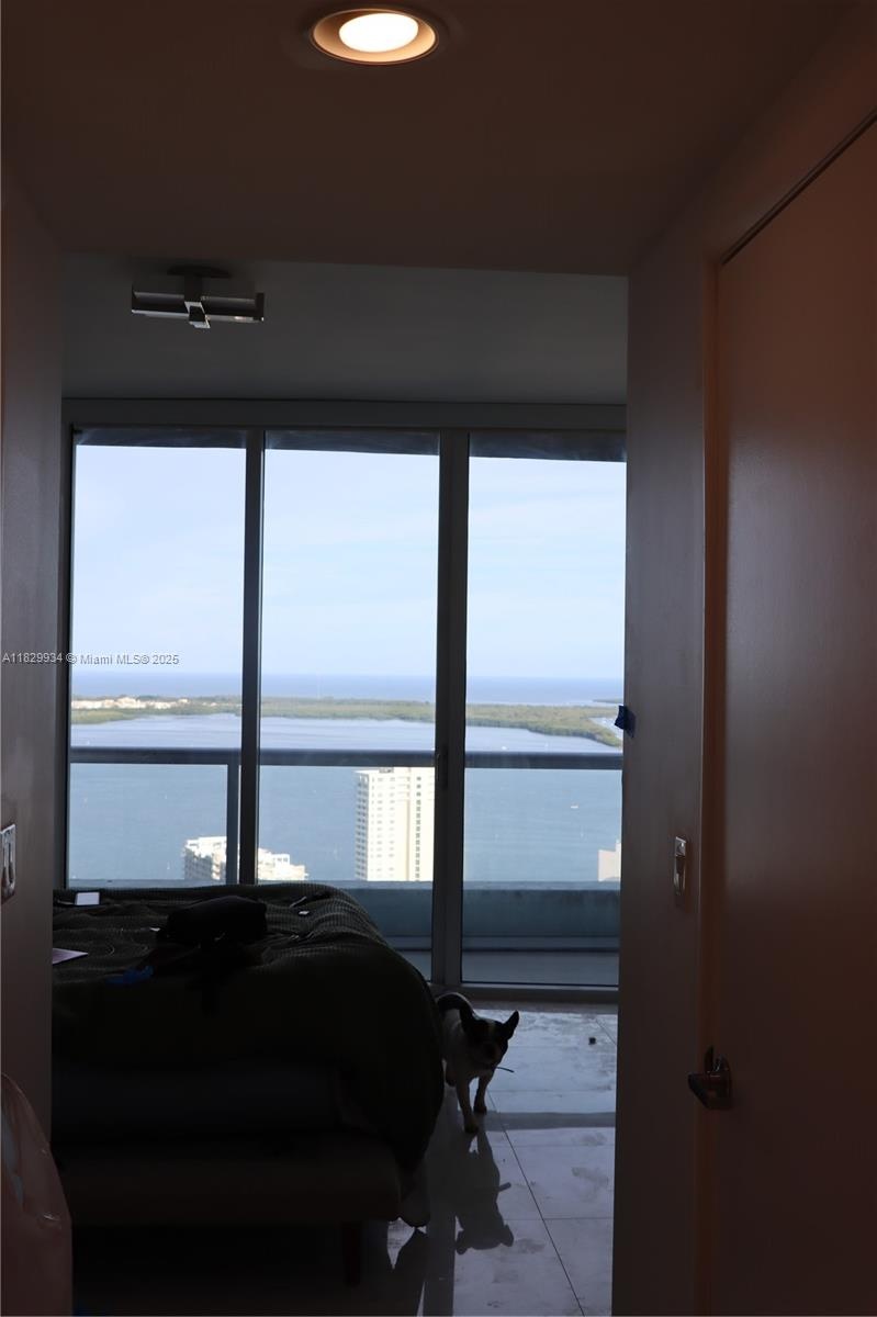- Alternate view of the main living area highlighting balcony access and the unobstructed Biscayne Bay backdrop.