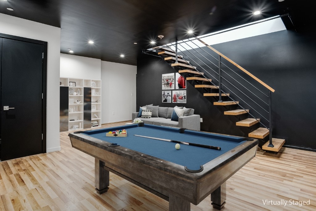 A unique reclaimed wood floating staircase leads to the expansive lower level, offering a versatile space which could become an office, den, or guest suite - paired with a half bath. This home also includes an in-unit washer/dryer, split-system heating/cooling, and abundant storage.