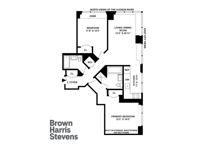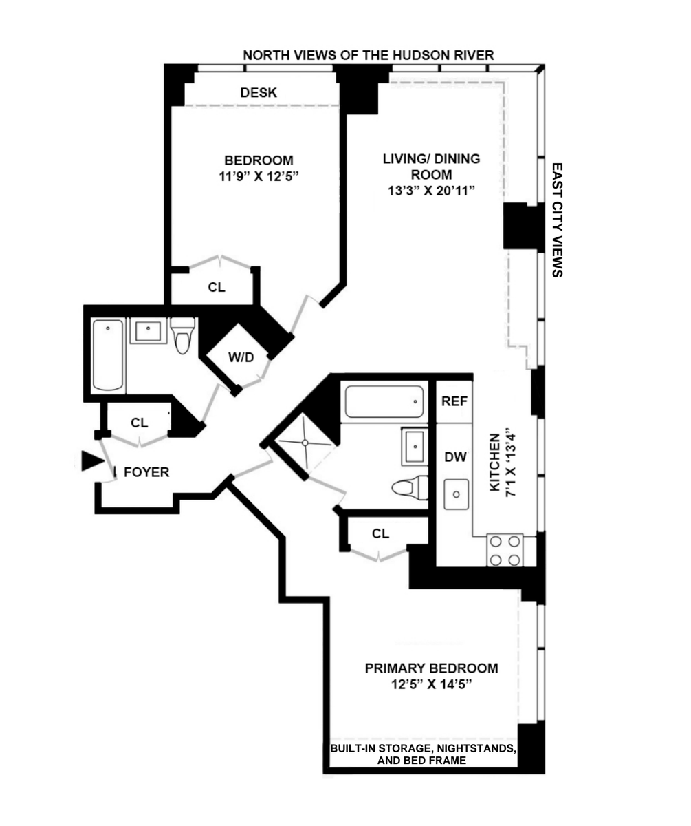 Perched on the 27th floor, this corner unit offers sweeping North and East views of the Hudson River and city skyline. The renovated kitchen features high-end appliances, including a Sub-Zero fridge, Miele cooktop, oven, and dishwasher, granite countertops, and a glass subway tile backsplash. Motorized blackout/light-filtering shades on all windows.