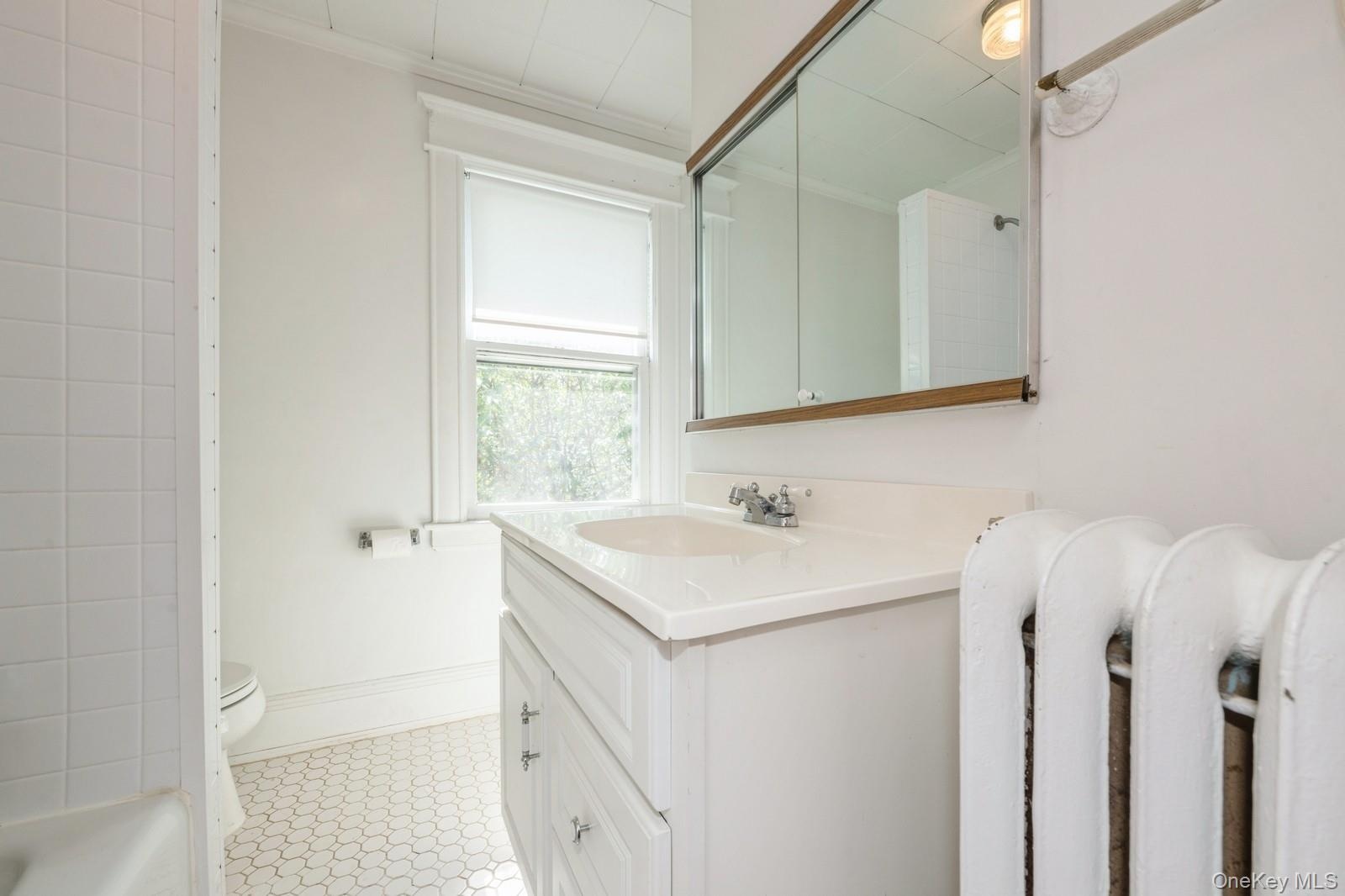 - Bathroom with vanity, ornamental molding, and radiator heating unit